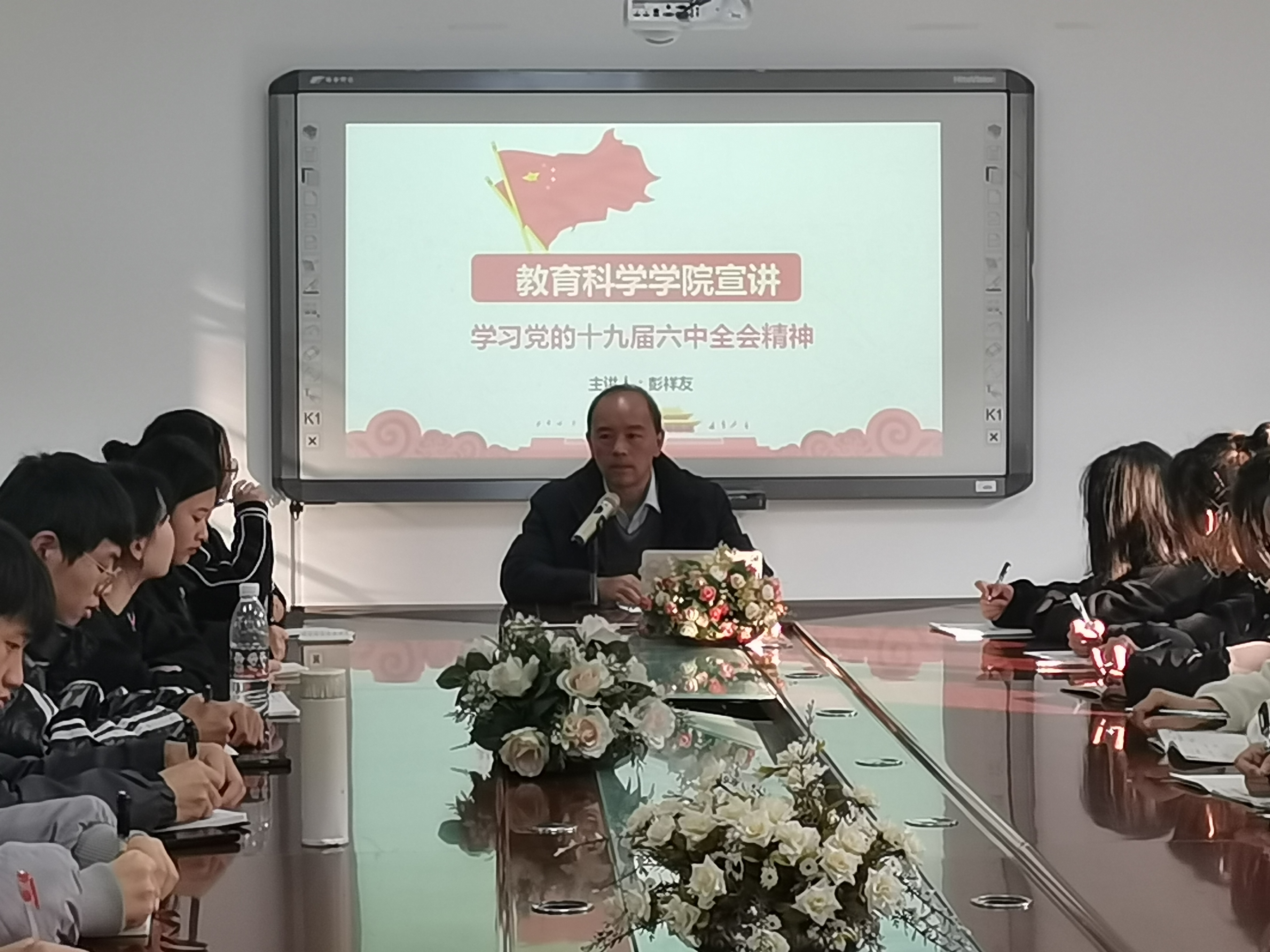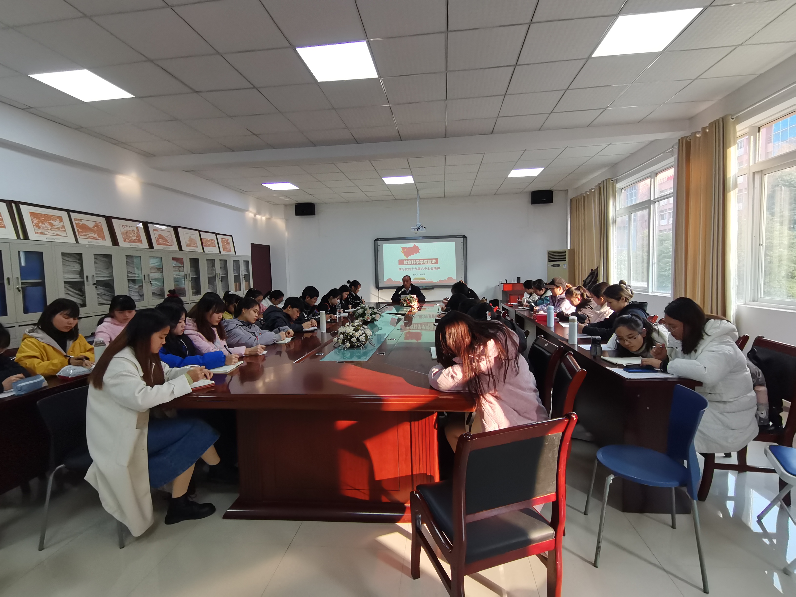在逸夫楼会议室宣讲学习党的十九届六中全会精神。主讲人学院党委书记彭祥友,党支部书记张源以及学生党员和入党积极分子参加会议。