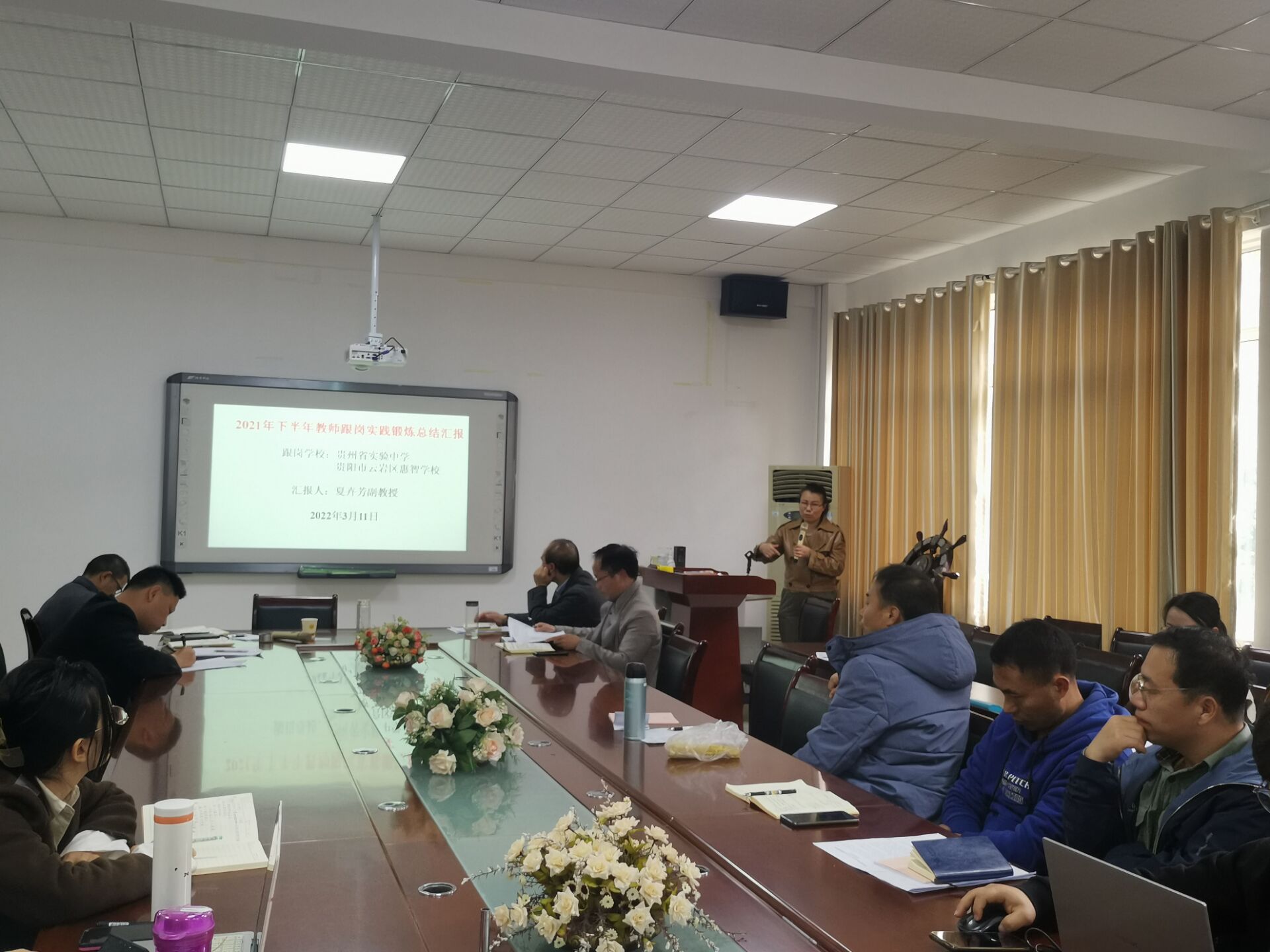 全体教师们进行分享与交流。夏老师说:作为一名全国防艾教育专家,2021下半年的跟岗实践工作虽然结束,但她会一直继续到贵州省各中小学(含特校)一线去为师生进行两性健康教育指导。接着,王雯颖老师介绍了在贵阳市六一幼儿园名师工作室的跟岗情况并与在场的老师交流,王老师将自己的心得与收获生动形象的介绍给了大家,并鼓励年轻教师积极参与跟岗实践,提升教学工作能力,也希望今后能够有更多的机会让青年教师深入一线进行跟岗实践,了解一线的教学工作情况,对毕业生的需求情况等,以便能为我系学生提供更为专业、有效的教学指导。