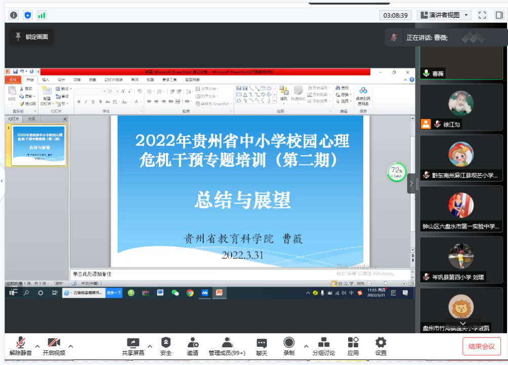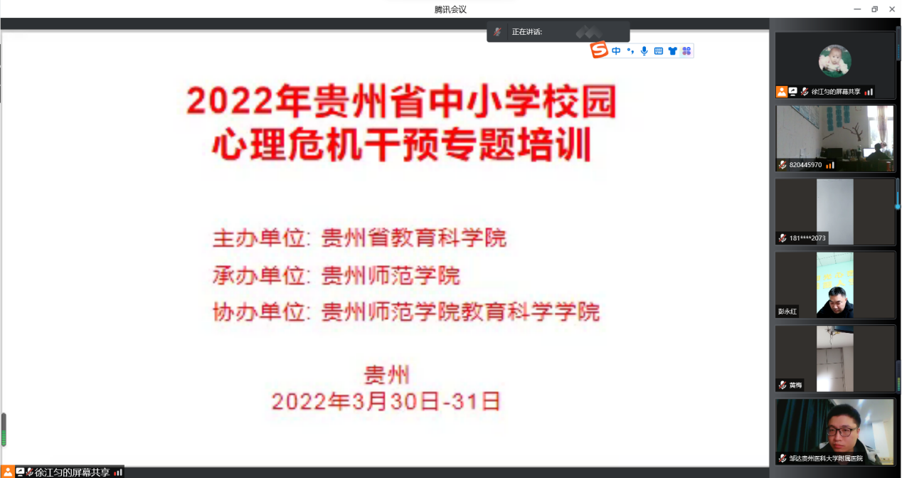 承办、教科院协办的2022年贵州省中小学校园心理危机干预专题培训(第二期)成功举办,各市(州)200多名专(兼)职心理辅导教师通过腾讯会议参加了培训。