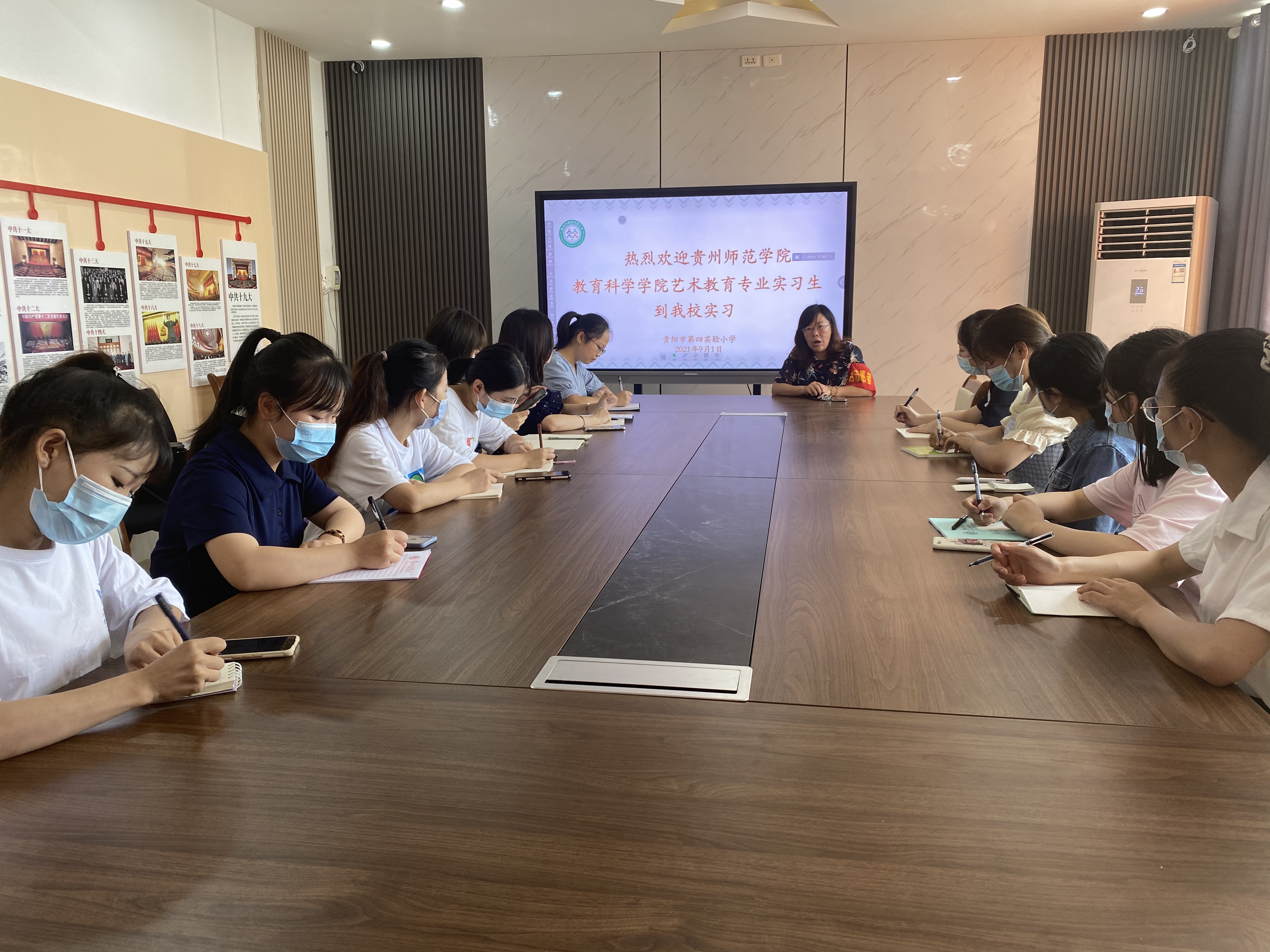 会议由实验第四小学实习指导老师陈舸主持。贵阳市第四实验小学李校长出席了本次会议,并与实习指导老师表达了对我校艺术教育专业实习生的热烈欢迎。首先,李校长向实习生介绍了贵阳市第四实验小学的情况,希望实习生能在本次实习中把理论和实践结合,同时也能在本次实习中有所收获。其次,陈主任详细阐述实习的相关工作。第一,本次实习工作的时间安排、作息安排。第二,实习工作分配将根据学生的专业方向(音乐或美术)安排进班听课,同时辅助一二年级班主任进行班级管理,并参与教研活动和家长会。第三,实习的教学安排,第一个月实习生适应环境熟悉工作,后续将安排艺术类课程教学实践及公开课教学展示。