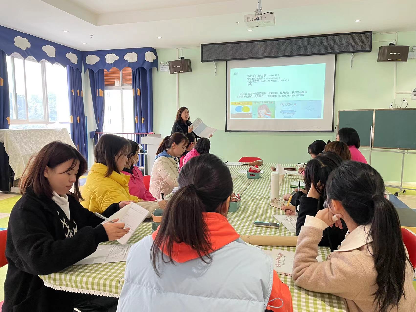 学前教育专业罗婷老师与乌当区高新幼儿园参与项目学习小组的十二名老师开展了教研活动,此次教研活动围绕“绘本的基本结构和作用”进行展开,由幼儿园大教研组长李婷老师主持。