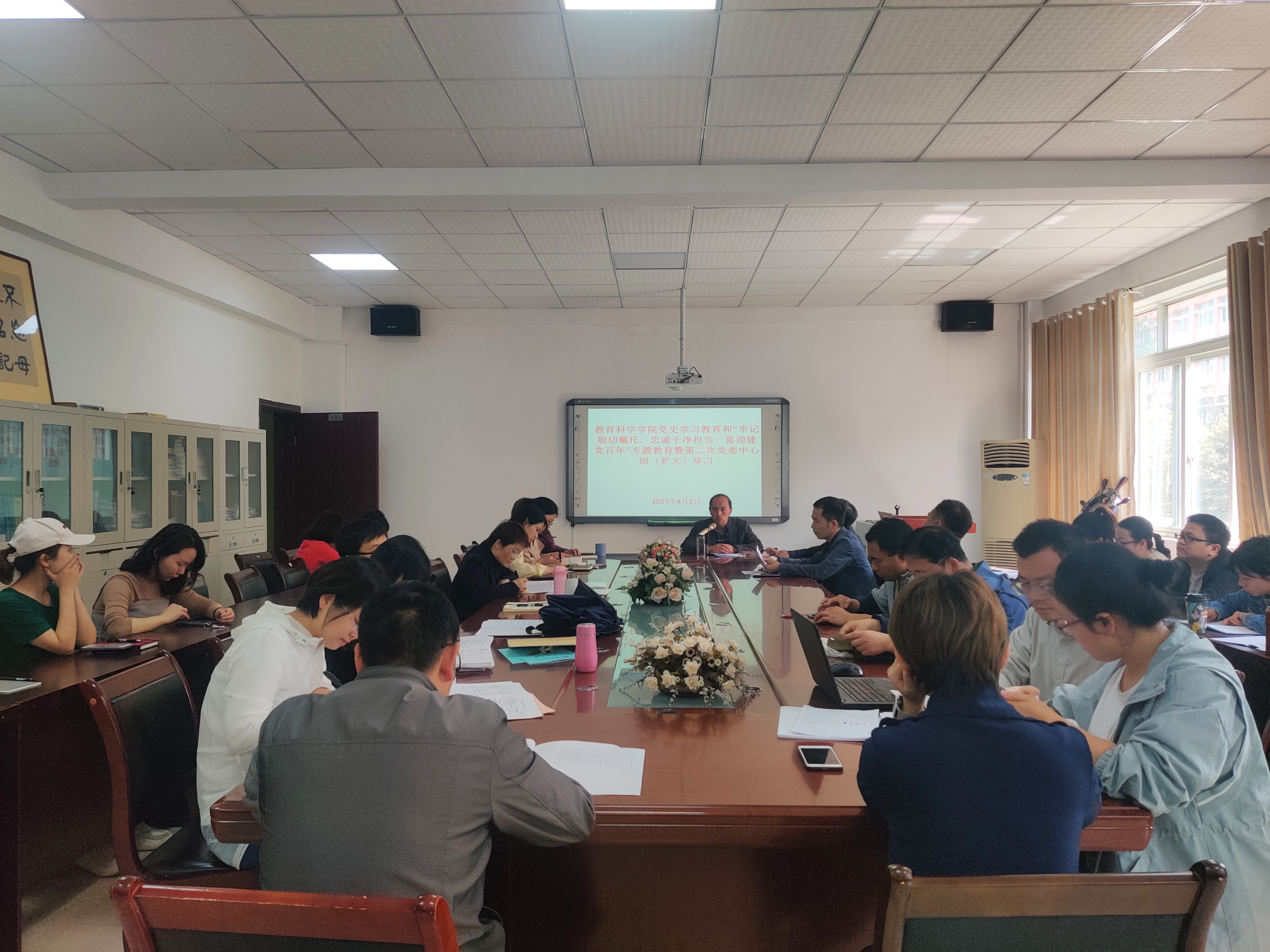 开展党史学习教育和“牢记殷切嘱托、忠诚干净担当、喜迎建党百年”专题教育动员暨第二次党委中心组(扩大)学习,学院党委书记彭祥友主持,学院党委中心组成员和全体教师党员参加。