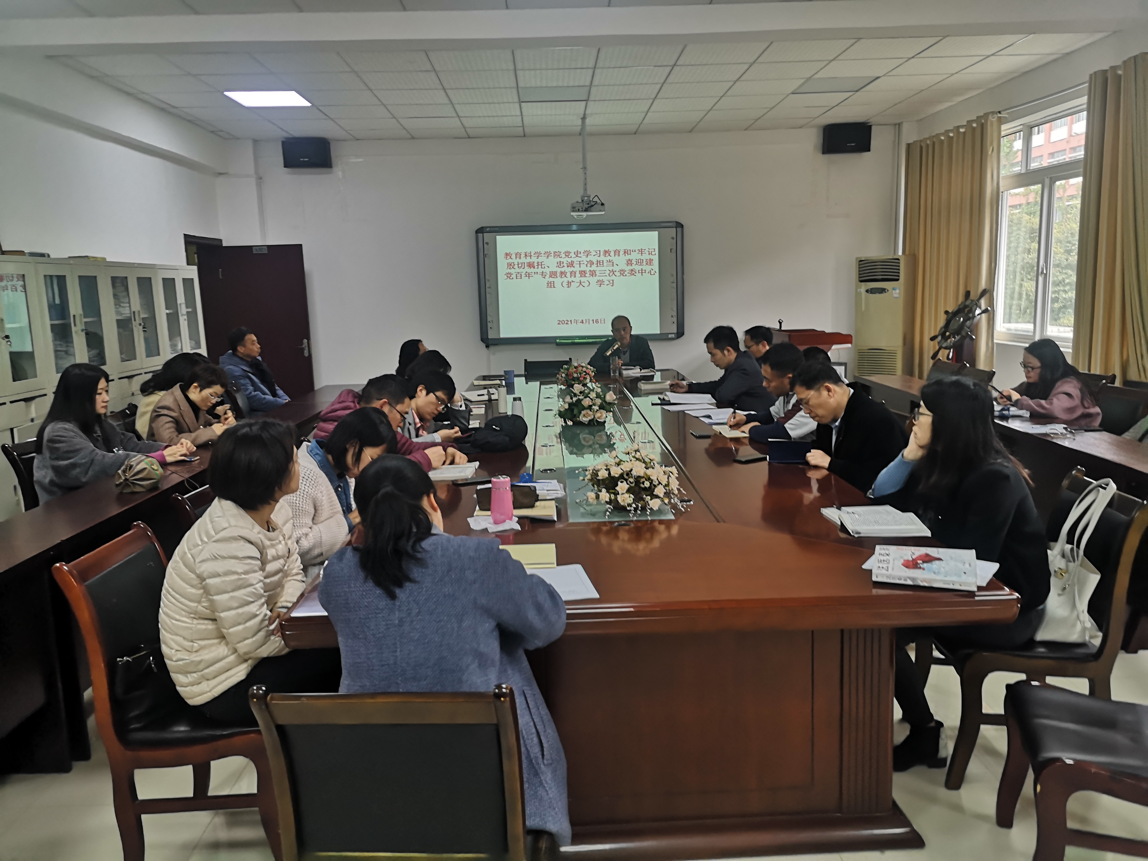 在逸夫楼学院会议室,举行党史学习教育和“牢记殷切嘱托、忠诚干净担当、喜迎建党百年”专题教育暨第三次党委中心组(扩大)学习,学院党委书记彭祥友主持学习,学院党委中心组成员,全体教师党员参加。