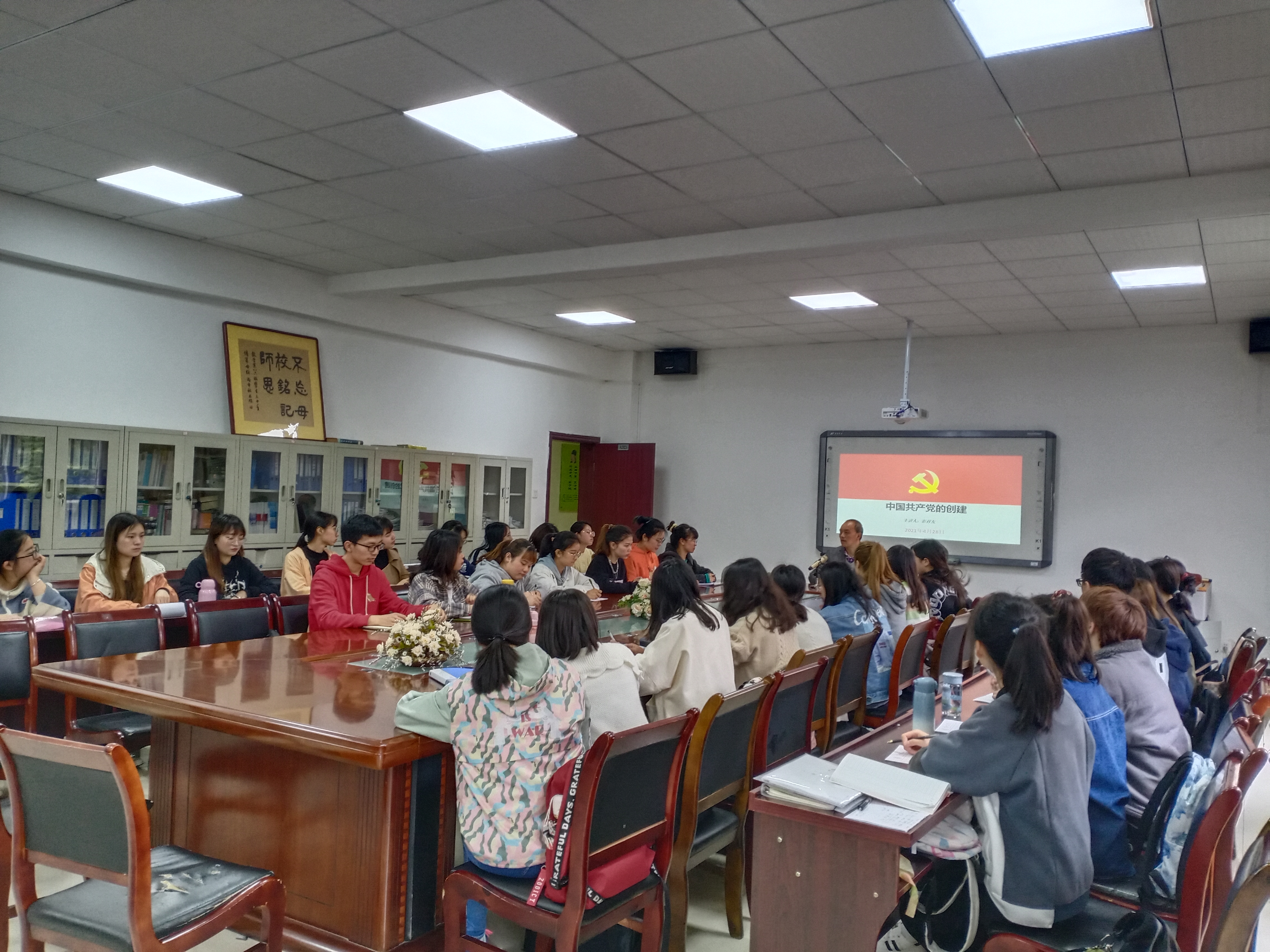 彭祥友以《中国共产党的创建》为题给全体发展对象开讲。今年是建党100周年,按照学校党委要求,全校正在开展党史学习教育,全体入党积极分子发展对象要认真学习好党史。在讲座中,他以中国的近代历史发展历程为基础,讲述从鸦片战争开始,中国社会现状,主要讲了辛亥革命、新文化运动和俄国十月革命、五四运动对中国的影响以及马克思主义在中国的传播,到中国共产党第一次全国代表大会的召开,向大家讲中国共产党的创建过程。中国共产党的创建,是中华民族发展史上开天辟地的大事变,具有伟大而深远的意义。从1921年建党到1949年新中国成立,中国人民在中国共产党的领导下,实现了民族独立,中国人民从此站立起来。在中国共产党的领导下,中国人民不断取得伟大成就,正在向实现中华民族伟大复兴的中国梦前进,坚持中国共产党的领导和社会主义道路是历史和人民的必然选择。青年大学生一定要坚定信仰,积极加入党组织,为中华民族的伟大复兴贡献青春和力量。