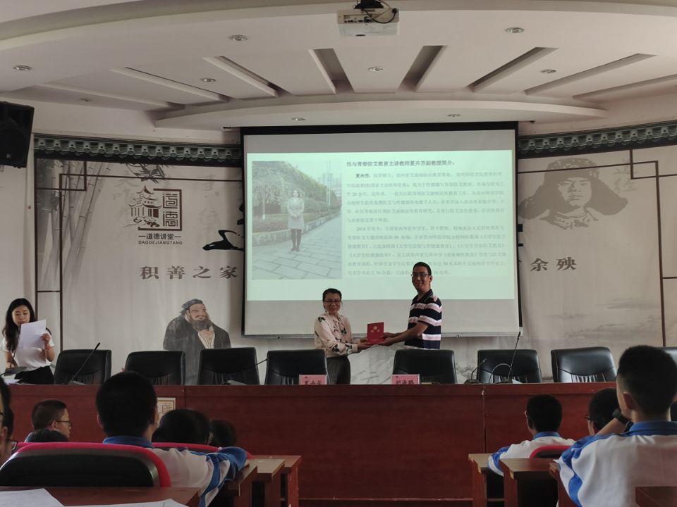 2021年5月11日下午,首先贵阳市乌当中学胡海鹏副校长给夏卉芳副教授颁发了聘书,聘请夏老师对乌当中学高中生进行两性健康教育讲座、咨询及师资培训等。随后,夏卉芳副教授围绕高中生青春期生殖健康教育、正常两性交往的概念、正确引导两性交往(案例分析)、青春期性安全教育等方面展开本次 “高中生青春期两性知识教育”巡回讲座,在讲座提问环节及讲座结束后学生们纷纷向夏老师倾诉自己的成长中两性困惑,夏老师现场一一给予解答并对学生进行心理疏导,讲座在热烈的掌声中结束。