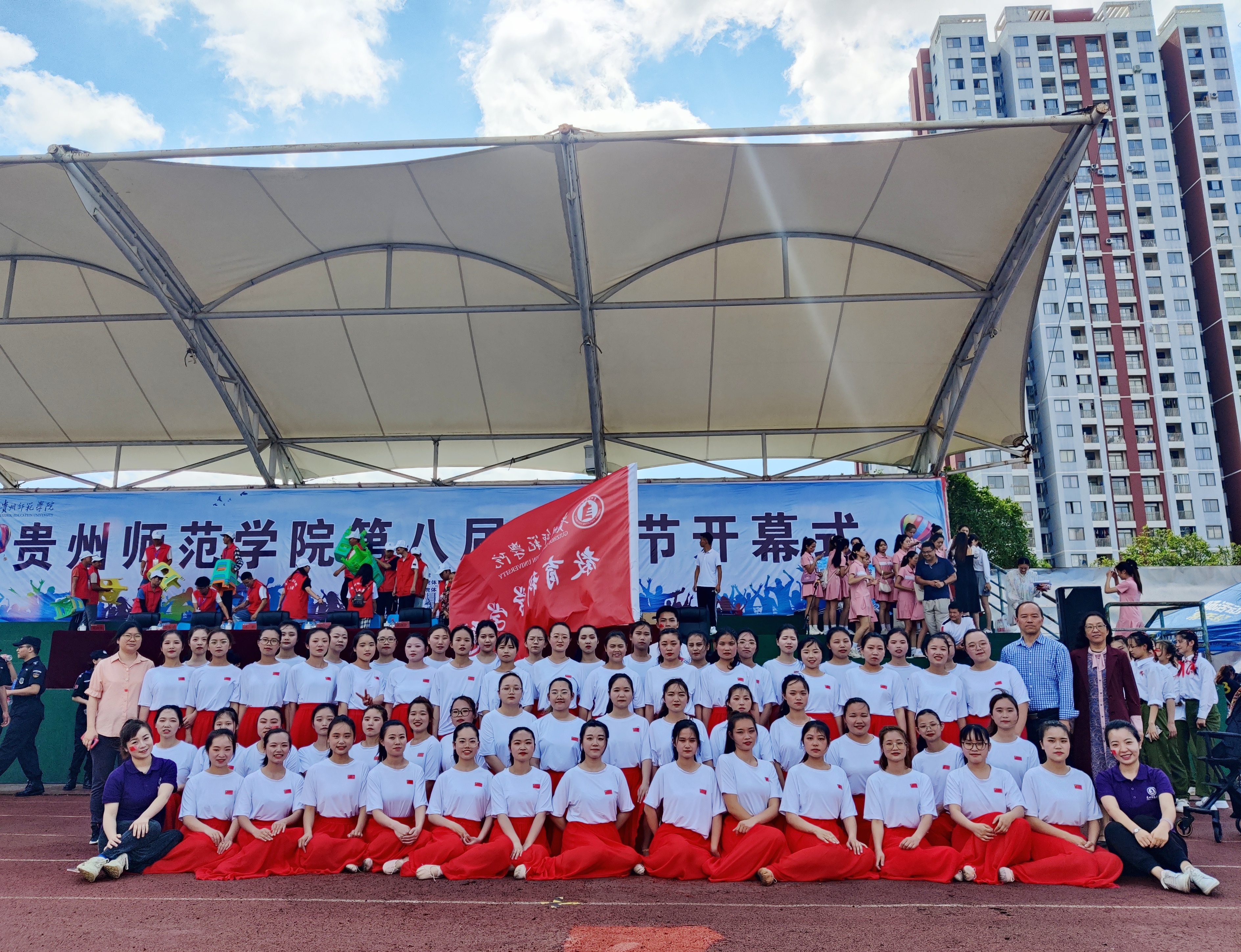 第八届体育节正式拉开帷幕,团委学生会全体成员忙碌于体育场各个角落做好服务工作;运动员们积极热身正在篮球场严阵以待;学院学生已就坐观礼台,准备目睹我院风采。
