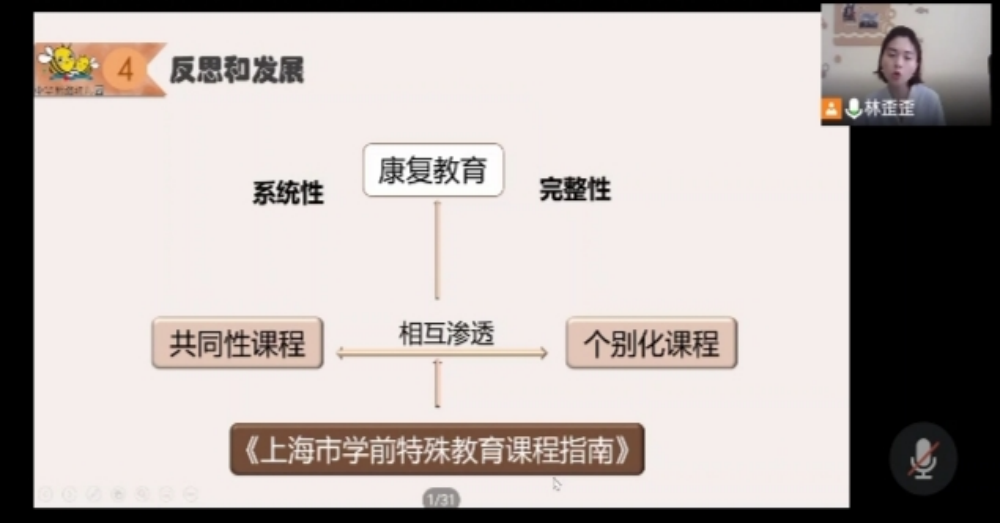 最后,林佩老师对学前特殊儿童的发展提出了启示与展望:构建学前特殊儿童家庭运动康复指导课程,规范家庭运动康复指导;完善学前特殊儿童家庭运动康复指导制度,保障家庭运动康复成效;构建学前特殊儿童家园共育合作模式,提升家园合作质量。