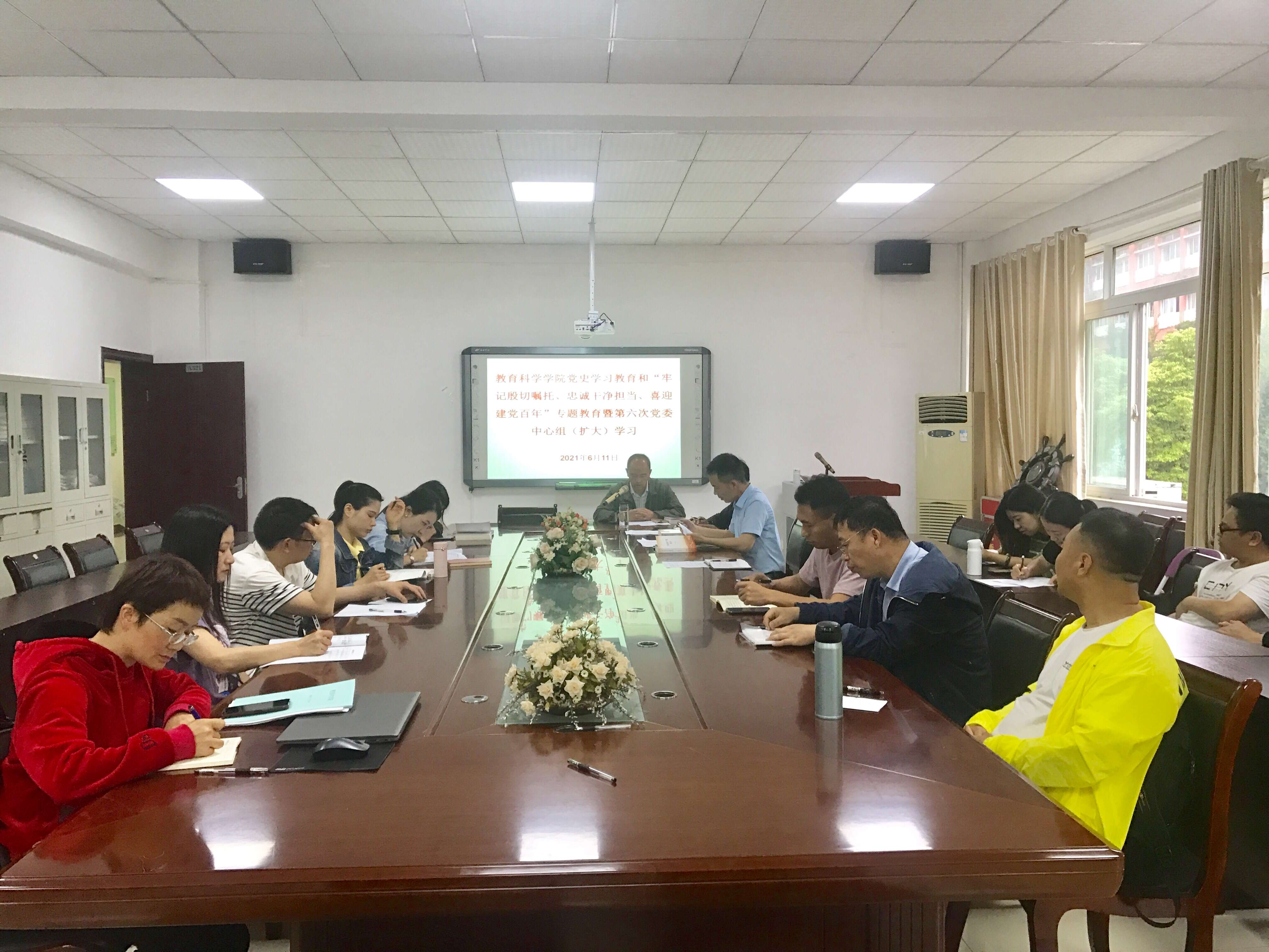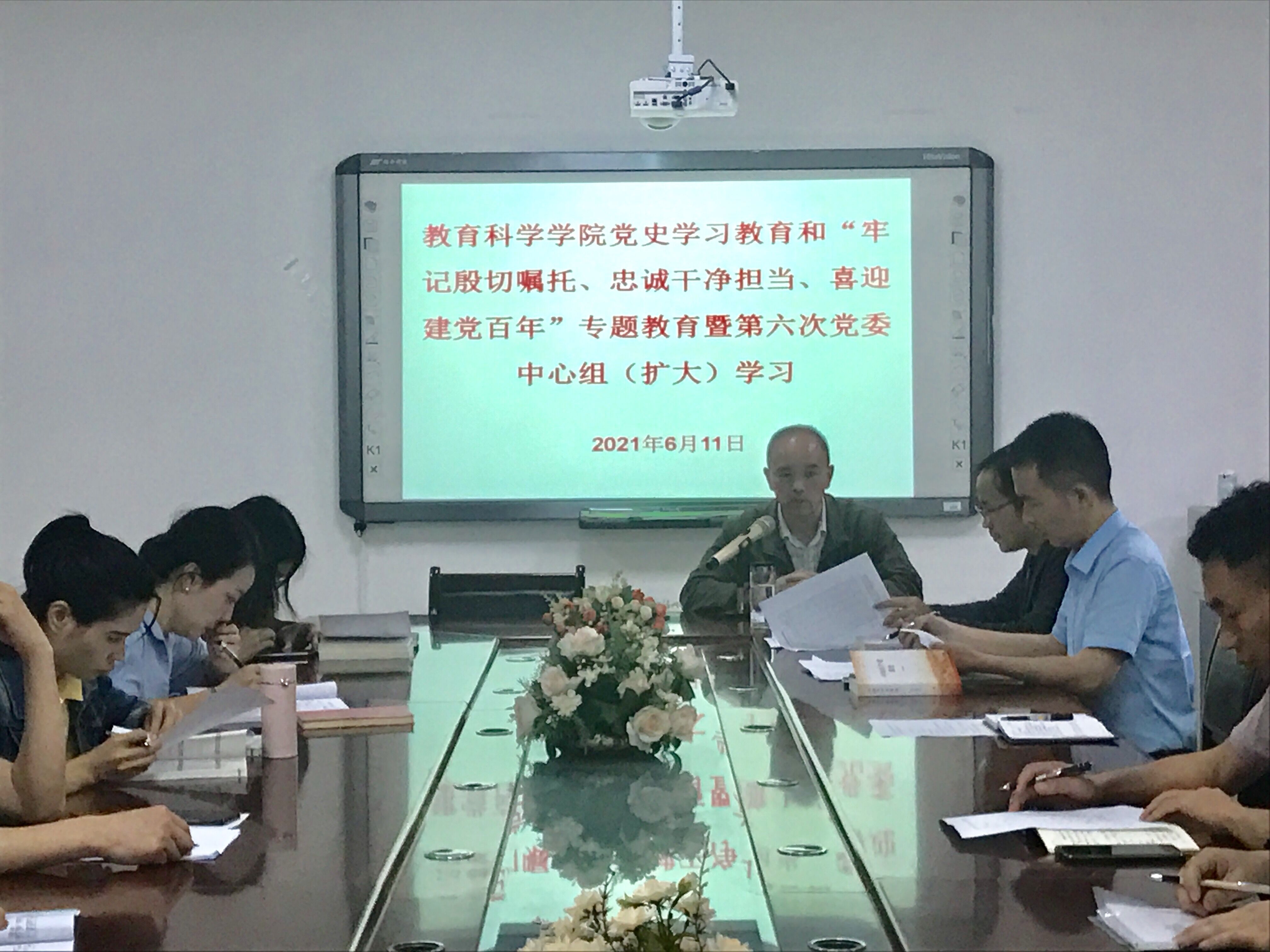 在逸夫楼会议室举行党史学习教育和“牢记殷切嘱托、忠诚干净担当、喜迎建党百年”专题教育暨第六次党委中心组(扩大)学习,学院党委书记彭祥友主持,学院党委中心组成员参加,全体教师党员列席学习。