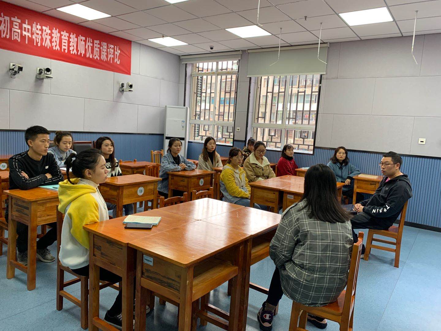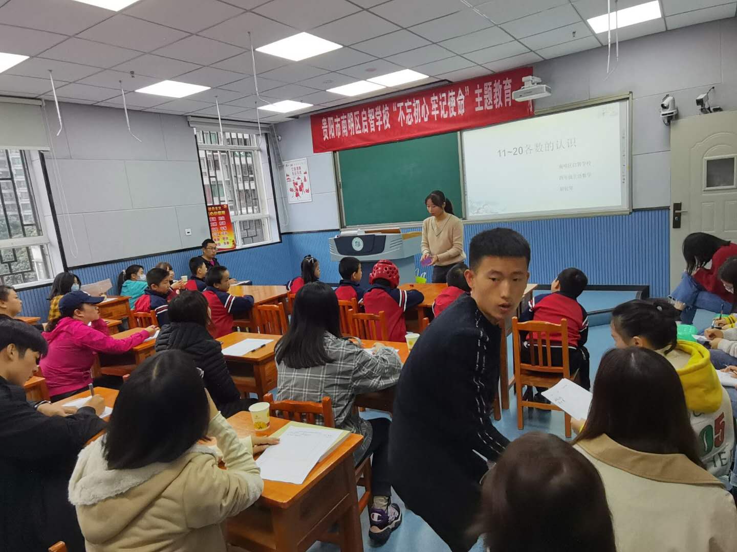 特教系杨娟老师、雷经国老师,南明区启智学校周丹副校长、教导主任和相关学科的教研室主任,在南明区启智学校实习的2017级特殊教育专业学生以及2018级特殊教育专业部分学生参与了本次基地校的教研活动和见习观摩。
