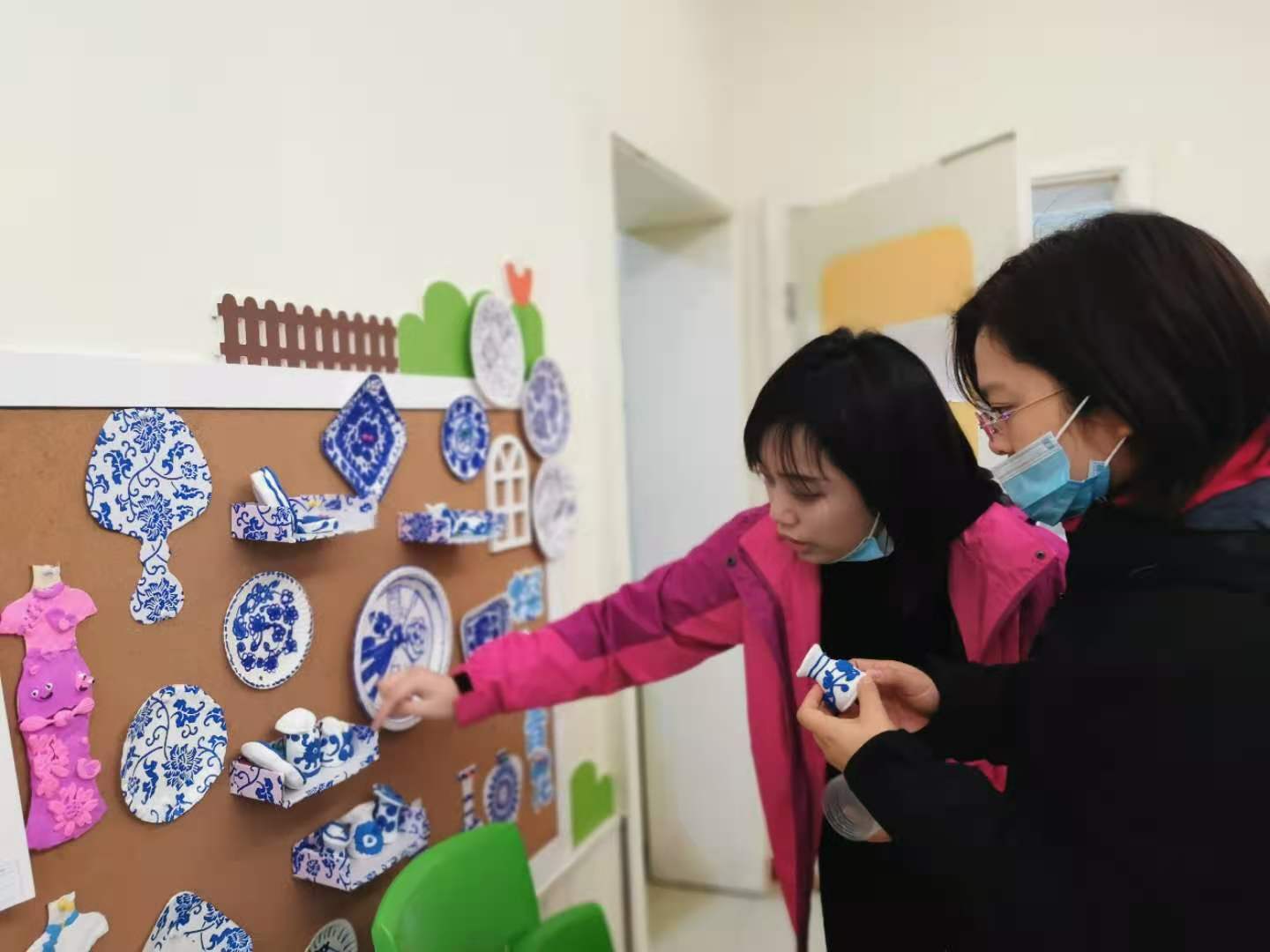 王雯颖老师赴贵阳六一幼儿园深入班级,对墙面设计、环境创设、特色主题活动、户外体育游戏等进行了细致地观摩研学。首先,在向园长的带领下,确定大四班作为观摩研学对象,进入大四班后,由主班老师对本班级环境创设以及特色主题活动进行了详细介绍,带班老师指出,本班主要以艺术领域中的美术为主线索,选取中国传统文化“墨韵青花”为主题进行环境创设,墙面的设计主要有:探秘青花、青花坊、水拓画、手绘古建筑等部分构成,孩子们在老师的引导下,“探秘青花”,从认识青花的色彩、图案、青花的物品、到孩子们亲自制作青花的作品,将制作的优秀作品陈列在青花坊中供孩子们参观学习。其次,在主班老师的带领下,观摩了大量孩子们手绘古建筑的作品,从最初简单的无意识涂鸦到有意识的画作,从简单的粗线条的勾画,到构图、设计,孩子们在老师的引导下有自己的想法,把自己亲眼看到的、想象的物品通过手中的画笔呈现出来,深入挖掘孩子们在绘画方面的潜能。在班级管理上,建立规则有序、有效管理班级。最后,在主班老师的引导下,参观了户外体育游戏。
