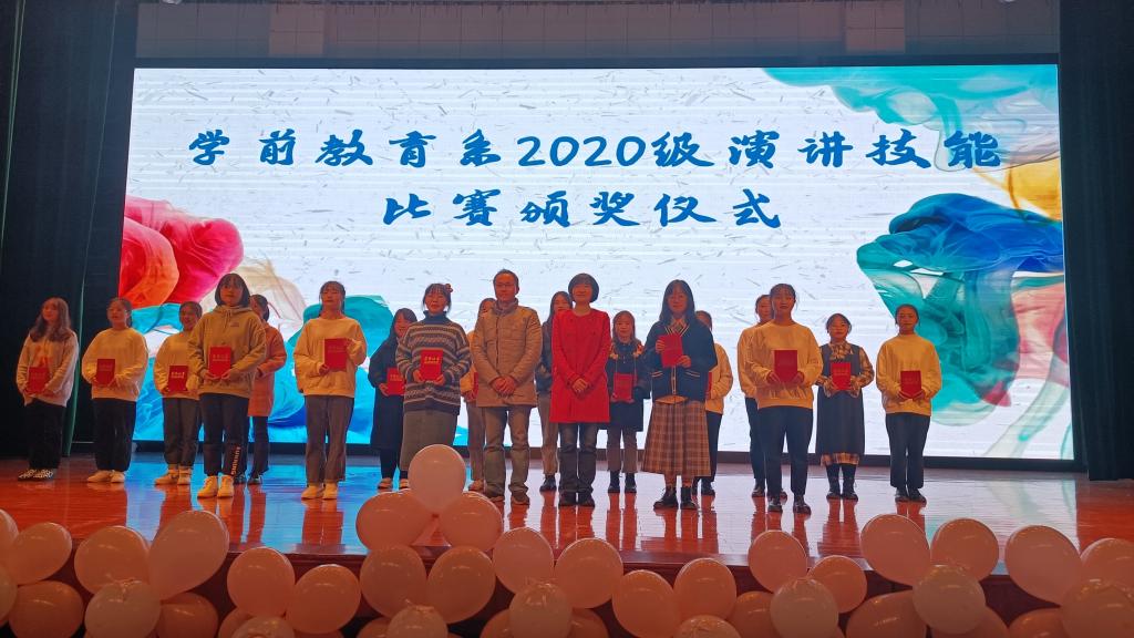 为适应新形势下的教学改革,加强我系学生的基本功训练,提升教学技能,我系特举办学生技能大赛。2020年12月14日星期一18:00,学前教育系第一届技能大赛颁奖典礼在逸夫楼演播厅隆重举行,学前教育系全体师生以及院领导均到场参加。