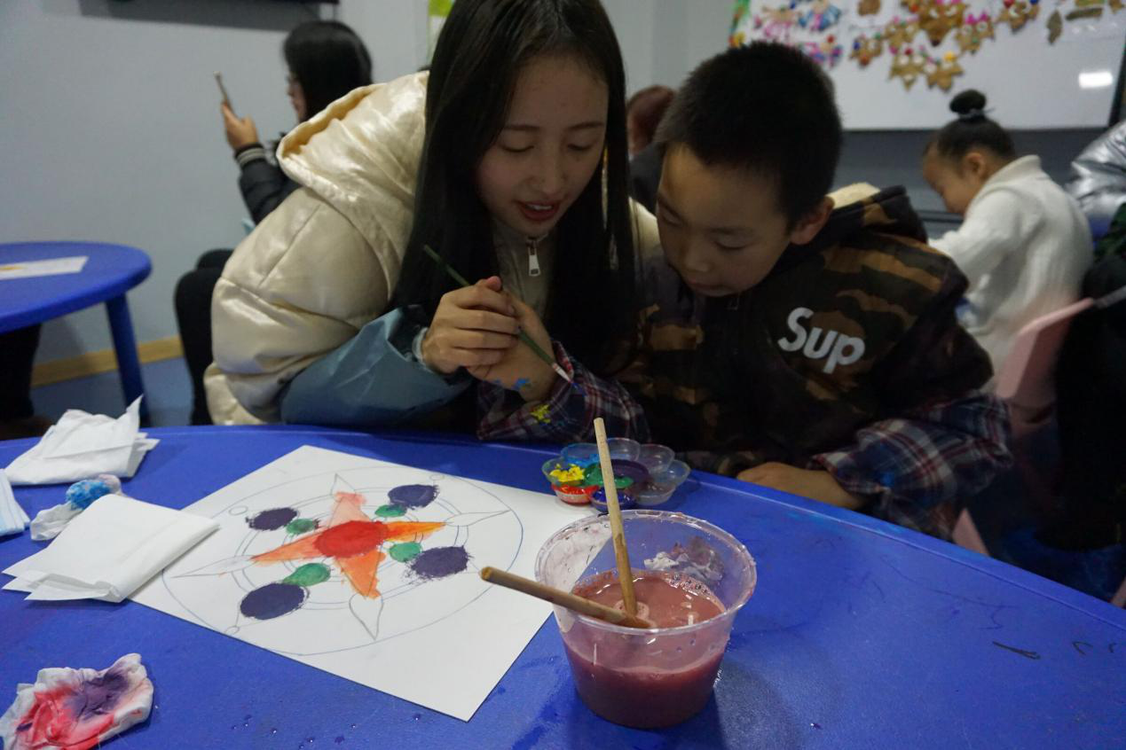 社团小伙伴正在耐心的教导小朋友画画