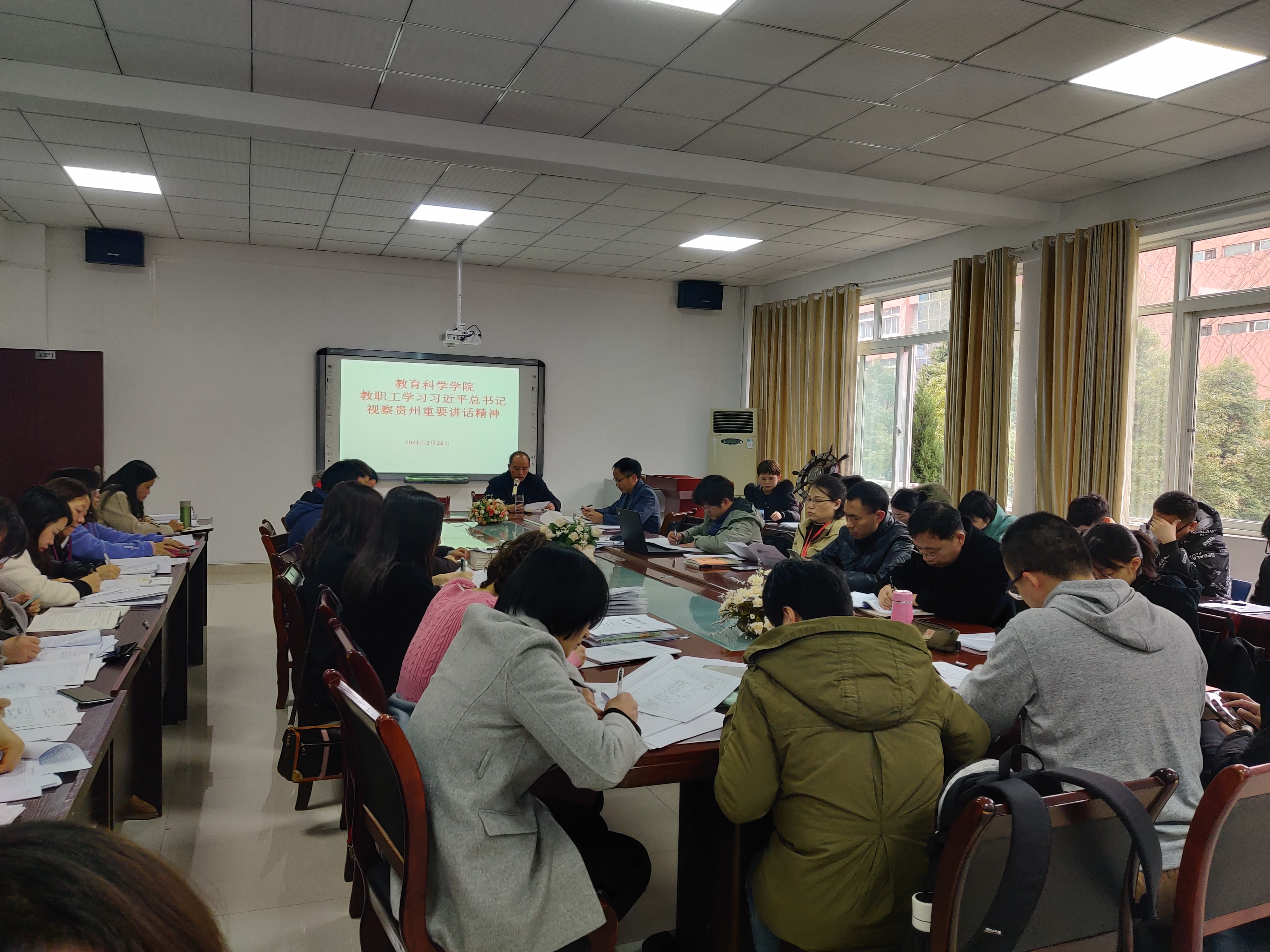 全体教职工在学院会议室集中,认真学习贯彻习近平总书记视察贵州重要讲话精神,学院党委书记彭祥友主持学习并宣讲。