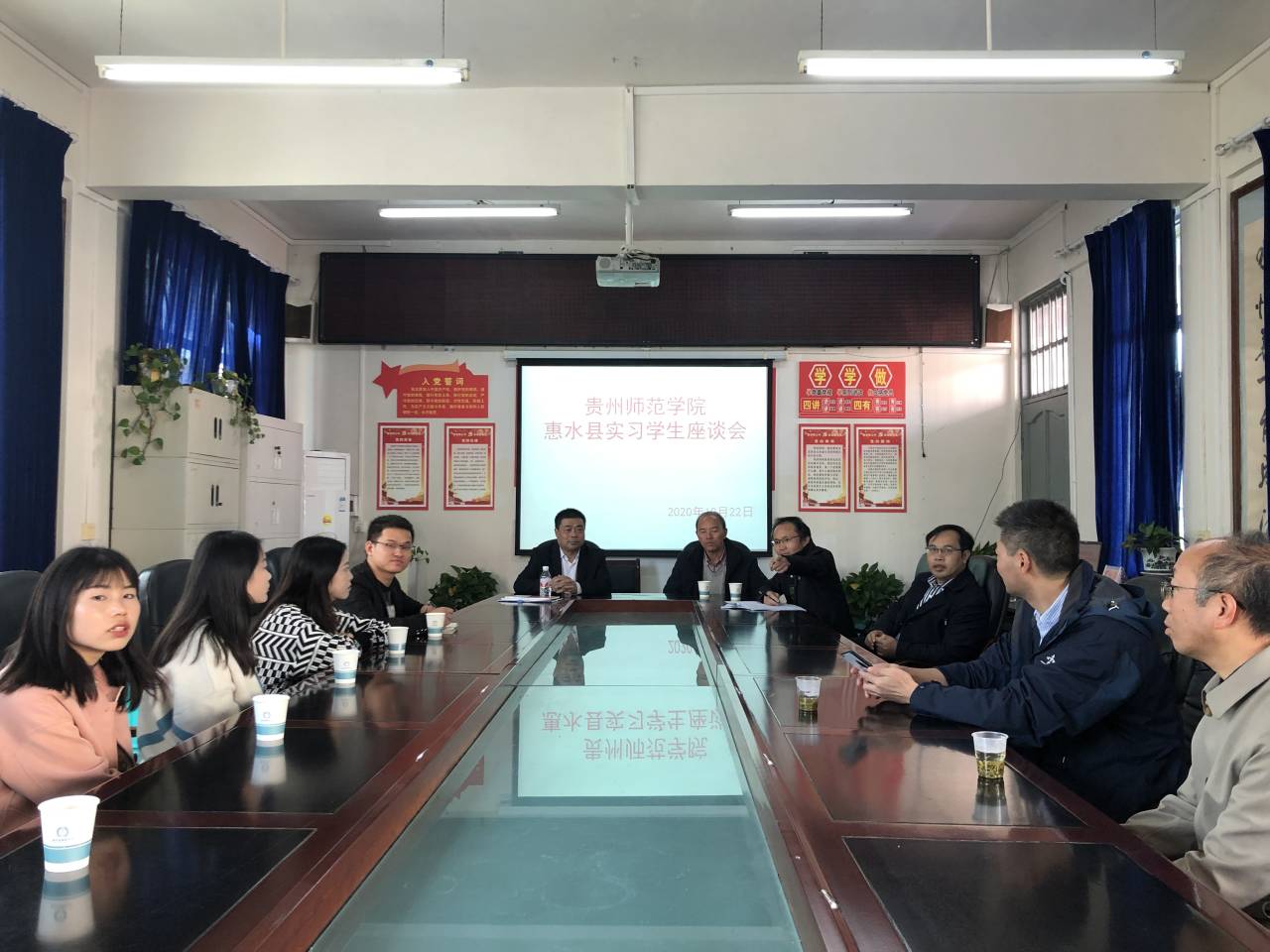 彭祥友书记和黎平辉副院长等就实习期间的听课上课、教研活动、班级管理等情况,与各个实习单位的校长、实习指导教师和实习生以座谈会的形式进行交流,给实习生带去学校的关怀和问候,了解实习生在过去两个多月时间里的生活与工作情况。在座谈中,惠水县第四中学、摆金中学、岗度中学的校长对我校实习生的工作表示高度赞扬,认为他们能够遵守学校的规章制度,完成学校要求的各项工作,勤学好问,积极主动,独当一面,责任心强。实习单位指导教师也表示,实习生基础能力扎实,在备课、上课、组织活动等方面具备专业教师的能力,很放心将学生和课堂交给他们。