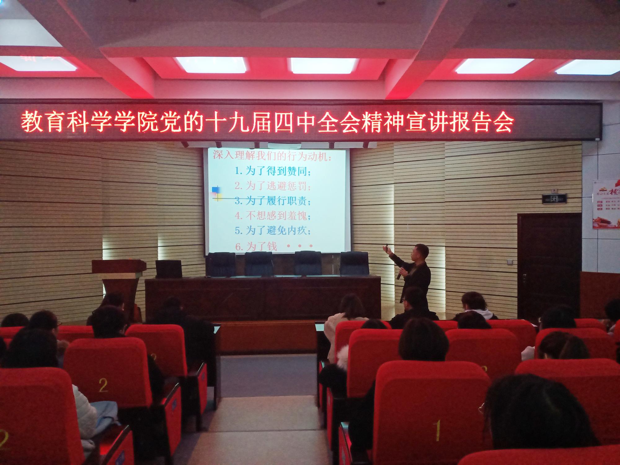 师生作了题为《真学真用真行精神 回归美好生活需要》的讲座。教科院党委副书记傅小芳、团委书记张源、各班级学生代表近120人聆听了宣讲报告会。会议由傅小芳主持。