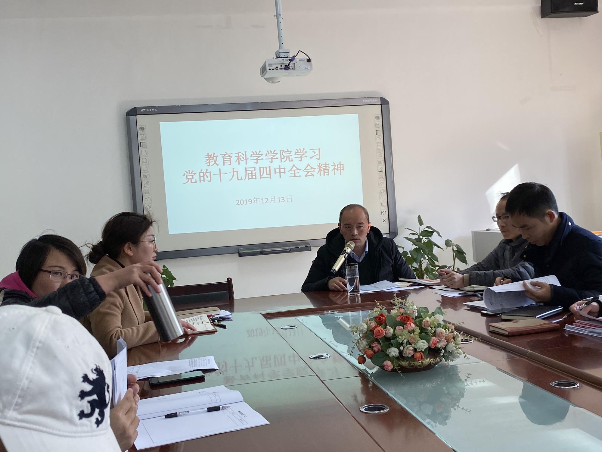 党委书记彭祥友在逸夫楼三楼会议室为本学院教职工宣讲学习党的十九届四中全会精神。