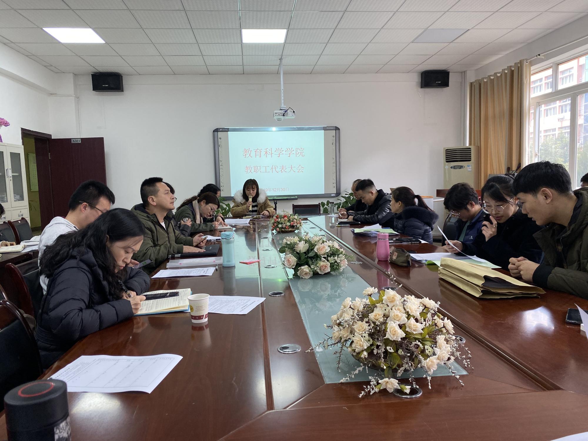 在逸夫楼三楼会议室召开教职工代表大会。学院党委书记彭祥友、院长刘红、党委副书记傅小芳、副院长黎平辉、副院长袁川以及全体教职工参加了此次会议。