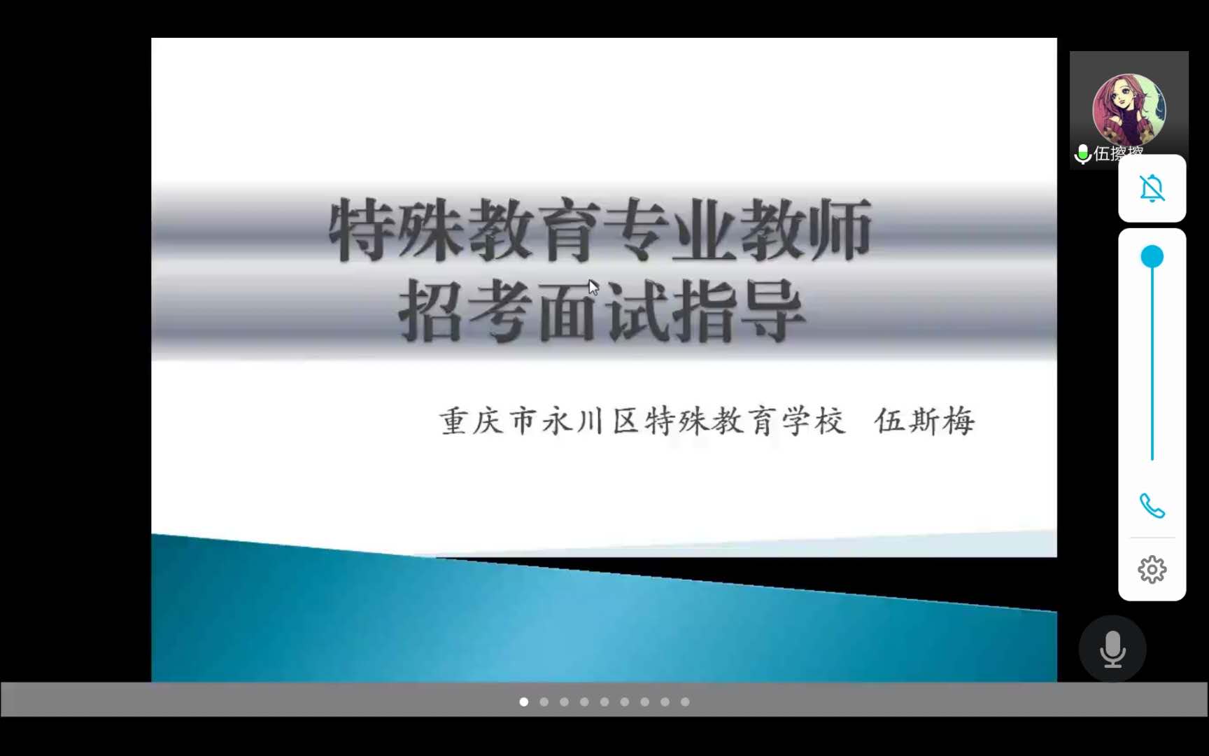 2020年5月24日19:00,重庆市永川区特殊教育学校伍斯梅副校长为我校特殊教育专业毕业班学生进行就业技能专项指导。本次特殊教育招考面试技巧的指导在通过网络进行,分享会由特殊教育系主任杨娟主持。