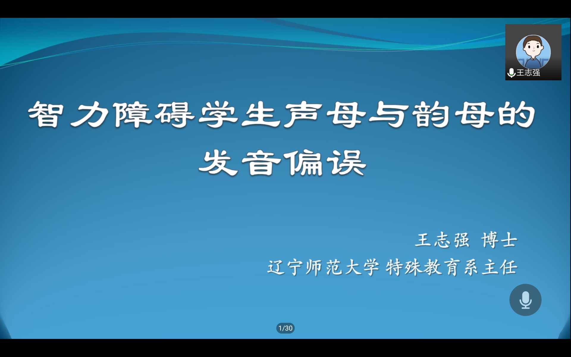 举办了以“智力障碍学生声母韵母的发音偏误”为例的教学研究线上讲座。辽宁师范大学特殊教育系主任、硕士研究生导师王志强博士为此次讲座的主讲嘉宾,我校特殊教育专业2018、2019级全体学生参与讲座。