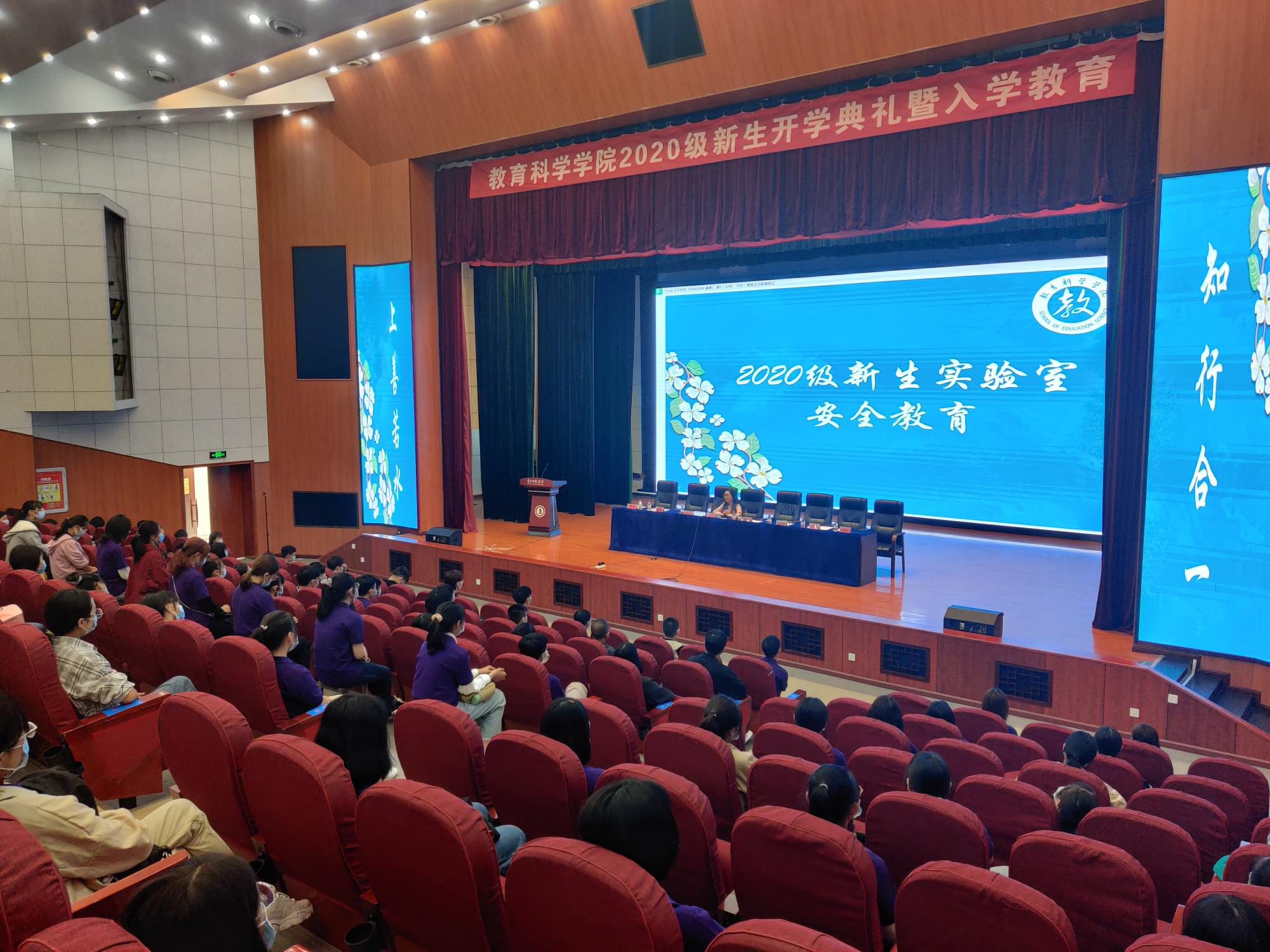在逸夫楼演播厅举行了2020级新生实验室安全教育培训,学院党委书记彭祥友、院长刘红、副书记傅小芳、副院长黎平辉、副院长袁川以及2020级四个专业的新生参与了本次培训,培训由刘红院长主讲。