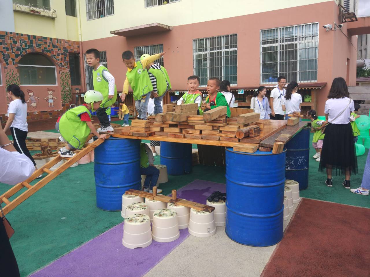息烽县小寨坝幼儿园由国培班主任冯静和学前教育专业李姿雨老师带队。首先,小寨坝中心幼儿园的教师及幼儿向国培学员在户外就自主游戏活动进行了集中展示;其次,围绕户外自主游戏活动开展过程中存在的“安全”、“家园沟通”、“游戏主题的生成”、“自主游戏活动中教师的指导策略”等问题,国培学员、小寨坝幼儿园教师及教科院学前教育专业教师在活动室展开研讨,会上国培学员还纷纷就自己所思所想和小寨坝幼儿园老师展开了讨论。