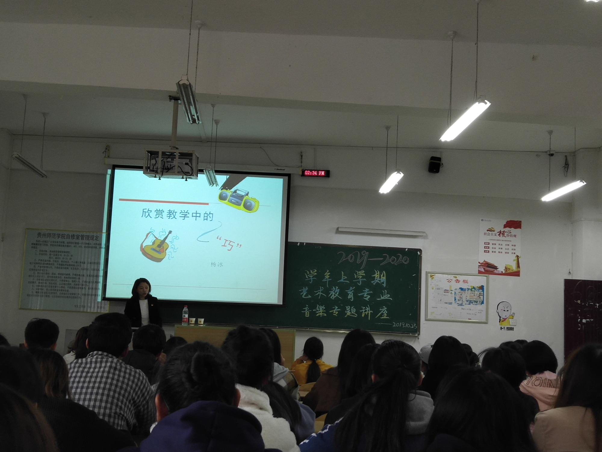 2019年10月25日下午,音乐专题讲座《欣赏教学中的“巧”》在逸夫楼603教室进行,讲座主讲人是贵阳市南明区苗苗实验学校党支部副书记、贵州省音乐骨干教师、贵阳市名师工作室主持人杨冰。学院2018级、2019级艺术教育专业全体学生听取了本次讲座,讲座由艺术教育系系主任马慧慧主持。
