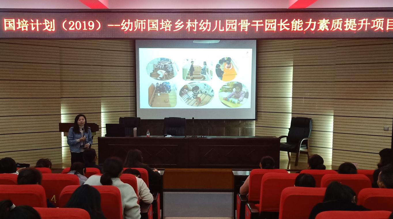 刘英老师主持,我校“国培计划(2019)”——幼师国培乡村幼儿园骨干园长能力素质提升项目的全体学员聆听此次讲座。