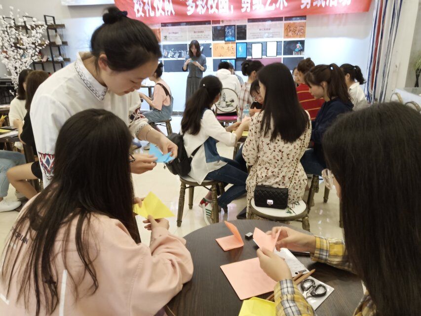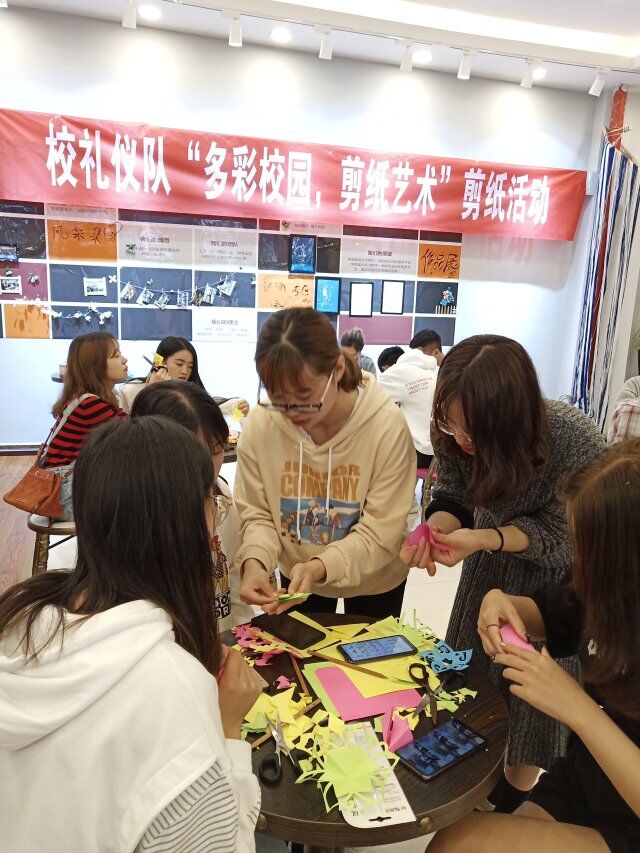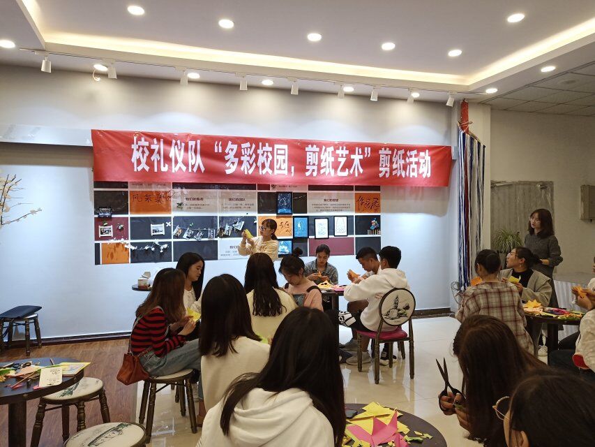 校礼仪队承办,大学生创新创业团队“玩教一体手工巧巧屋” 授课并指导的“多彩校园,剪纸艺术”活动,于 17:00在大学生文化创意基地正式开始,此次参与学习的人员约50人。