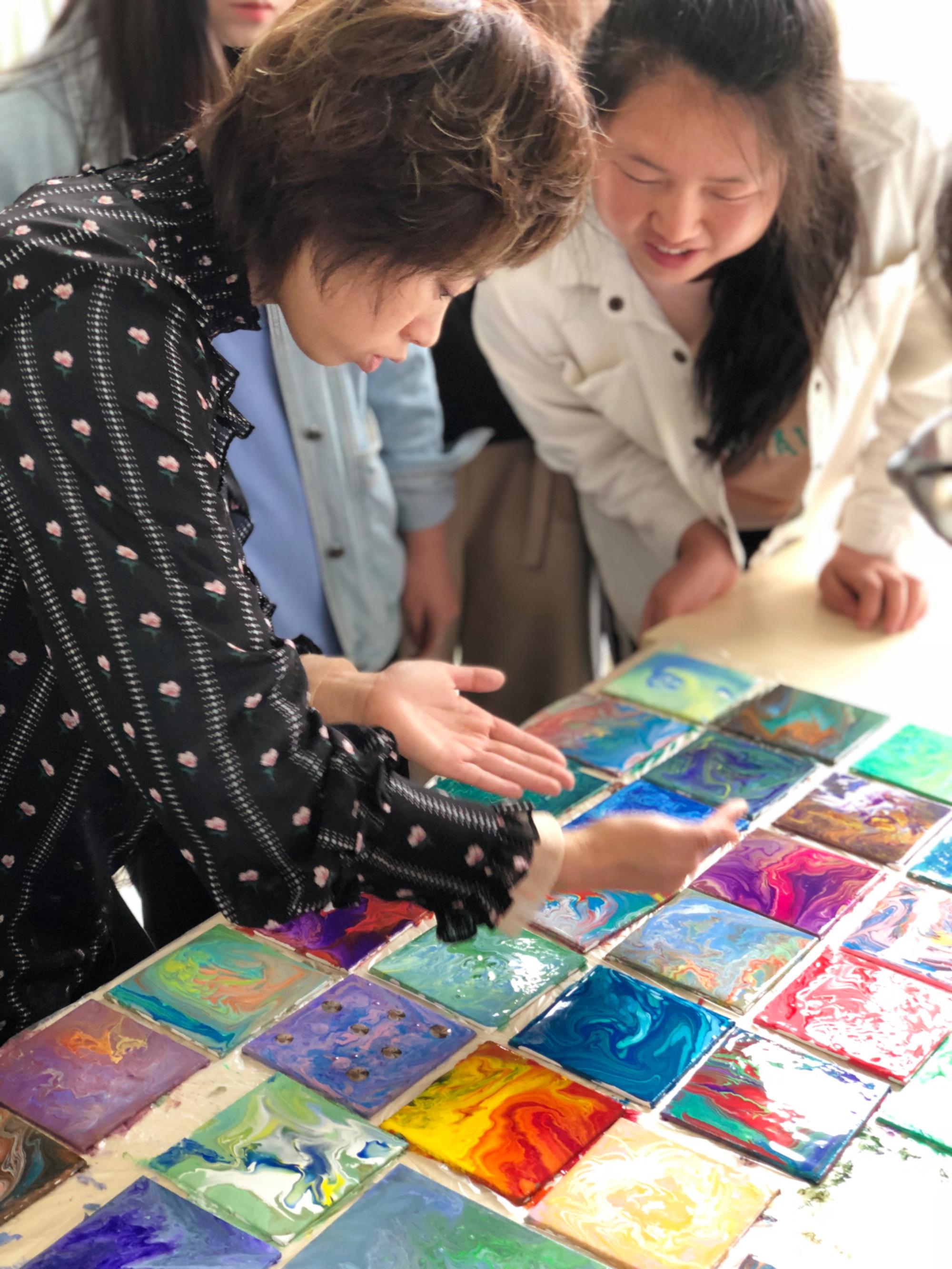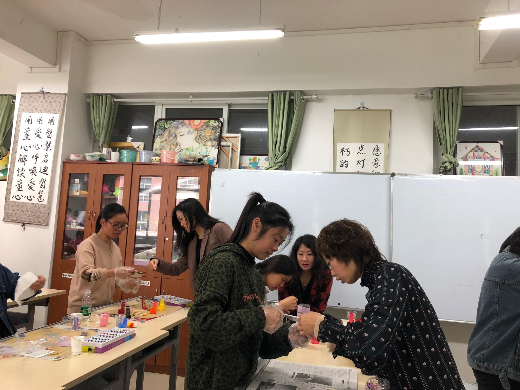5月9日上午,在系主任马慧慧老师的带领下,教师们对参加比赛的申利丽老师进行了听课,并进行了评课等活动。申利丽老师授课班级为学前教育专业2018级(1)班,授课内容为《创意美术——流体画“年轮”》,申老师首先利用多媒体、教师作品展示、工具材料展示进行了基础知识讲解,其次申老师进行实际操作师范,让学生从工具、材料、媒介、色彩搭配、技法、技巧等方面进行了学习,最后学生进行实际操作对知识、技法、技巧进行巩固,因为是实操性、创意类课程,所以课堂上更注重学生“创意作品”的制作过程和成果,每位同学的“创意”都不同,申老师对每位同学都进行了细心指导。