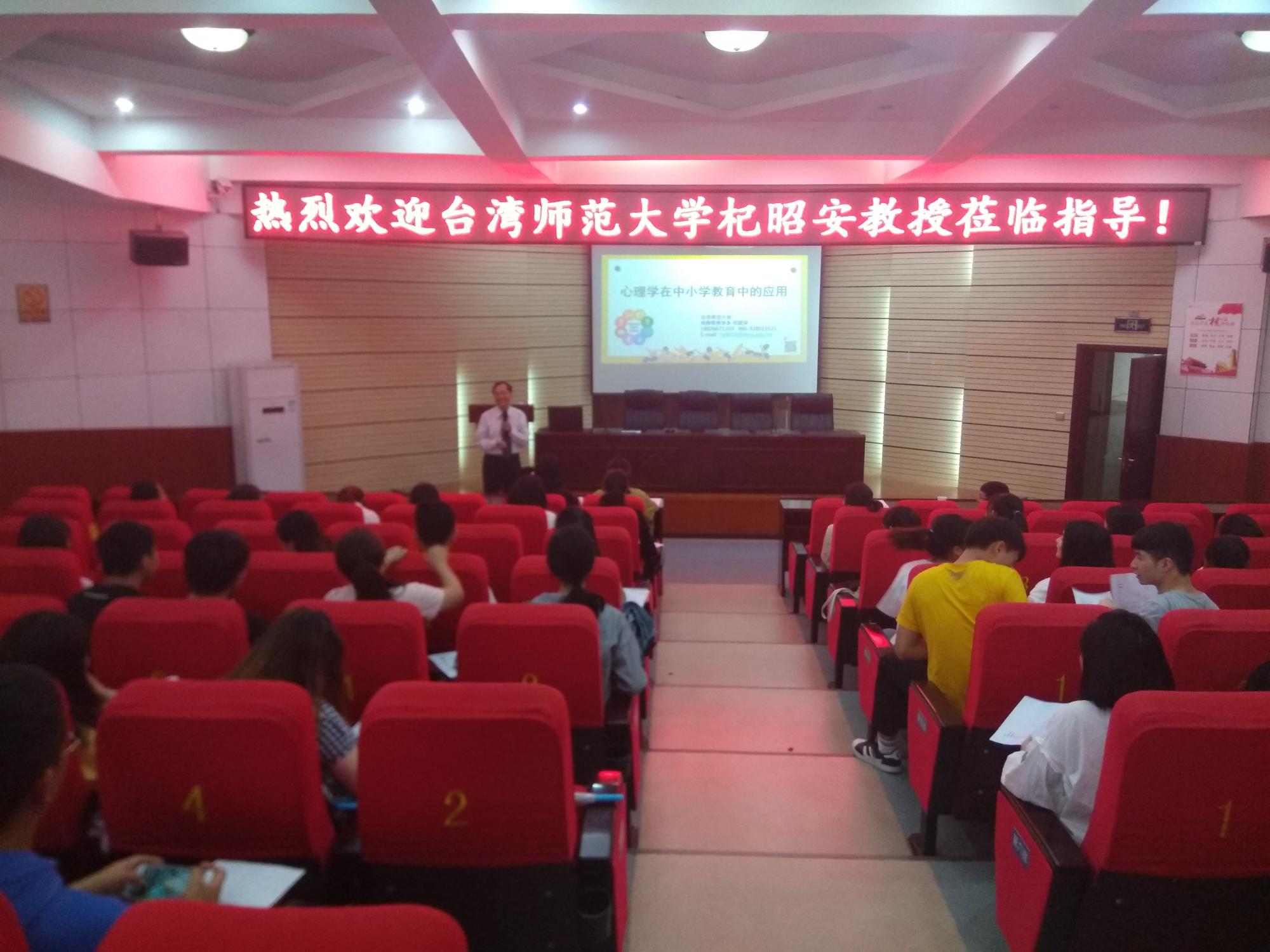于2019年6月6日上午10点,在宁静楼150阶梯教室邀请台湾师范大学杞昭安教授开设“心理学在中小学教育中的应用”主题讲座。参加此次讲座的有2016级应用心理学专业的全体学生,罗凯、刘婧、乔君堂等老师参加了此次讲座,讲座由应用心理学系主任罗凯主持。