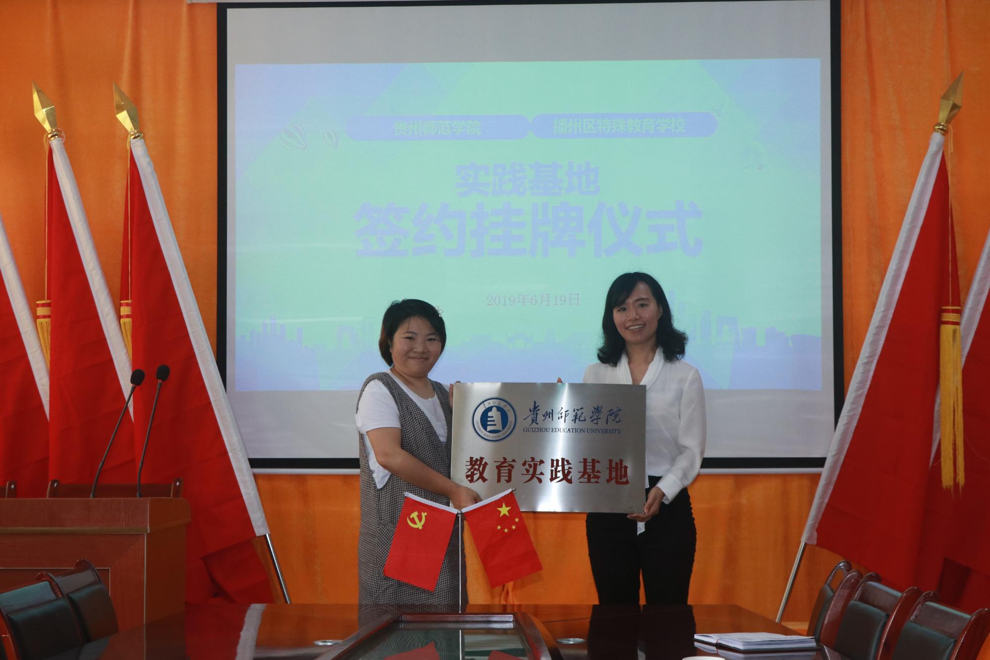 特殊教育系系主任杨娟赴遵义与遵义市播州区特殊教育学校校长杨启勇、副校长钟安婷以及该校教师代表共同商讨教育实践基地建设的具体内容和条目,并达成一致,双方签订共建教育实践基地协议并完成授牌仪式。