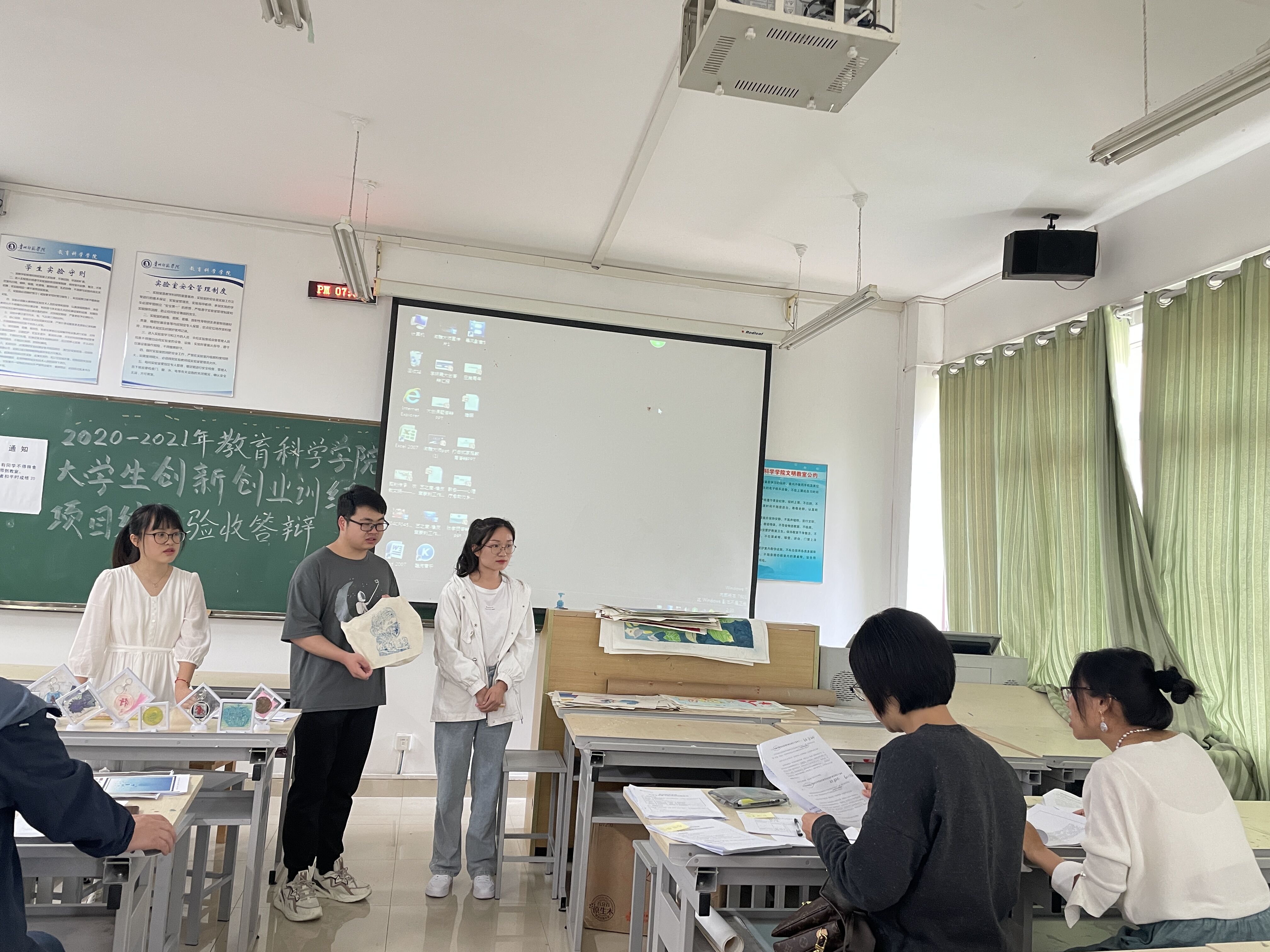 此次参与答辩的项目组共有十支,由郑玉莲、张金勇、刘婧、游超颖四位专业教师对他们的研究成果进行验收答辩,郑玉莲老师任组长,申利丽老师在答辩前强调答辩规则、细节,以确保验收答辩顺利进行,两位2019级艺术教育班的同学作为验收答辩现场助理。