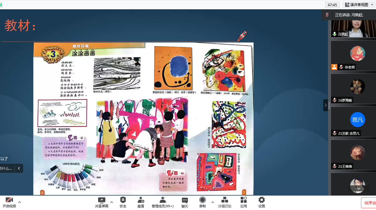 5月24日,特邀请了南明区尚义路小学的冯筑红美术教师,为艺术教育专业2019级美术方向、2020级、2021级的同学们进行了以《美术课堂教学设计的目标与实施策略》为主题的讲座。讲座中,冯老师解析了自己的一堂优质美术课《涂涂画画》,从学情分析、教学目标、教学重难点、课堂导入、教学过程等方面为同学们讲解了如何把一堂美术课上好。讲座结束后,冯老师为大家答疑解惑,同学们积极与老师互动,提出了一些关于美术教师以及美术学科方面的知识,冯老师都一一耐心解答。通过此次讲座,同学们学到的不仅是关于美术学科的教学技能,还学到了如何与学生沟通。这场讲座为同学们下半年去参加实习工作提供了一些指导,也更加坚定了同学们日后加入教师行业的信心。