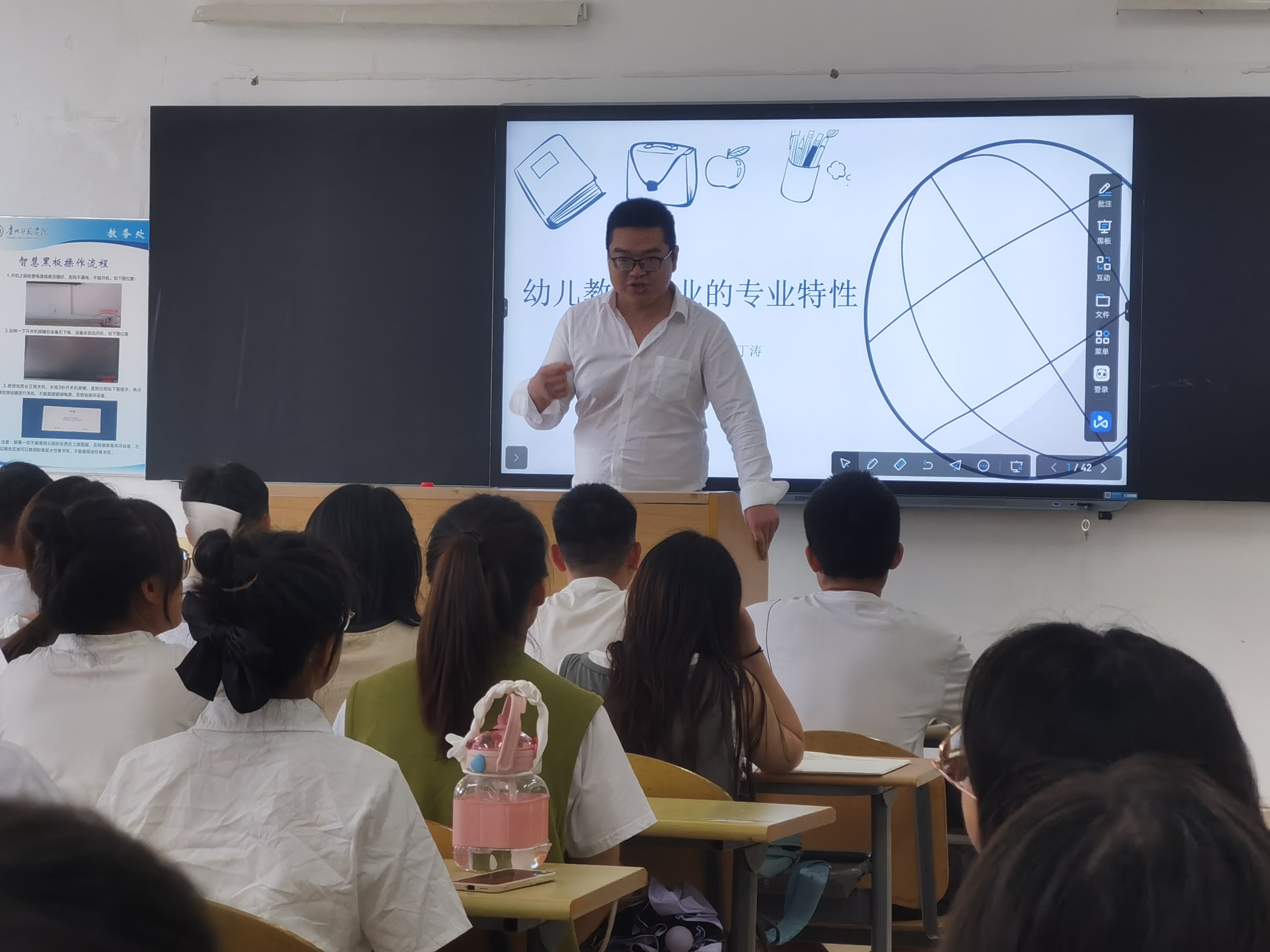 7月1日,贵州省乡村名师、本专业2013届毕业生、修文县六广镇幼儿园教师丁涛,应邀为2019级学前教育专业本科生做了题为《幼儿教师职业的专业特性》的讲座,此次活动在逸夫楼202教室开展,2019级共计110名学生参与其中,2019级学前教育一班学习委员欧志标主持此次活动。