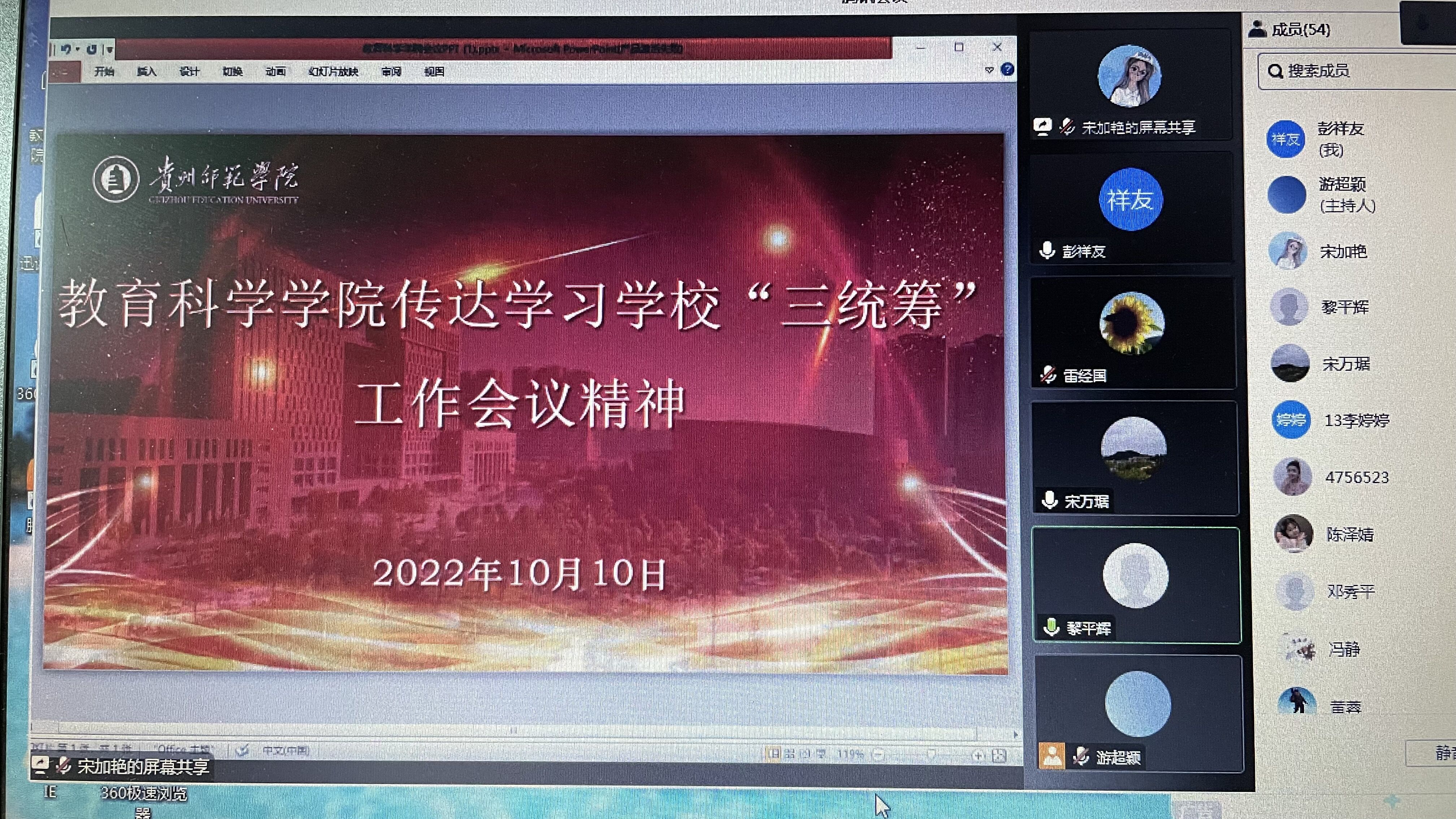 10月10日20:00,教育学学院召开学习学校“三统筹”工作会议精神,会议通过线上方式腾讯会议召开,院长宋万琚主持,全体教职工参加会议。