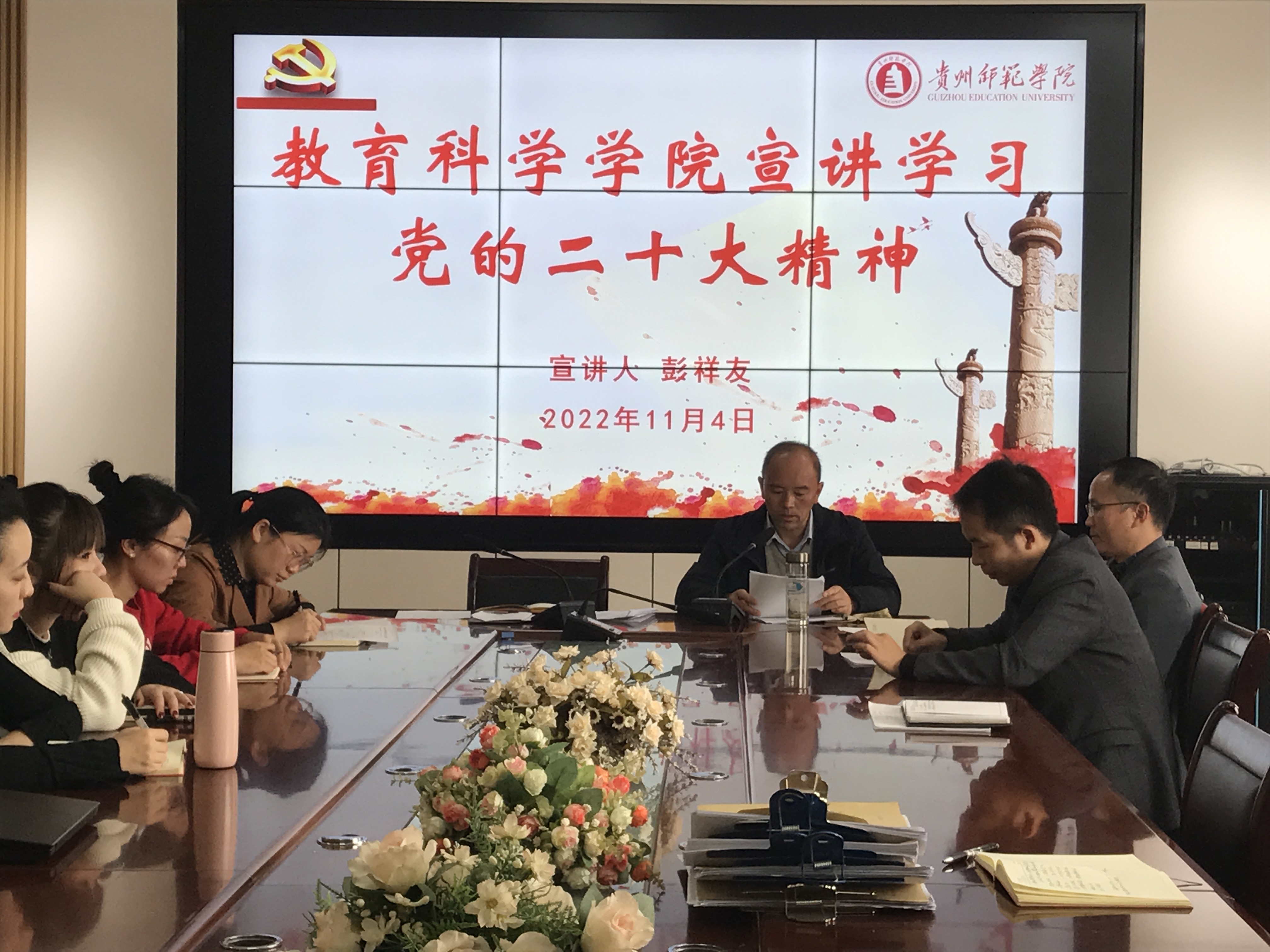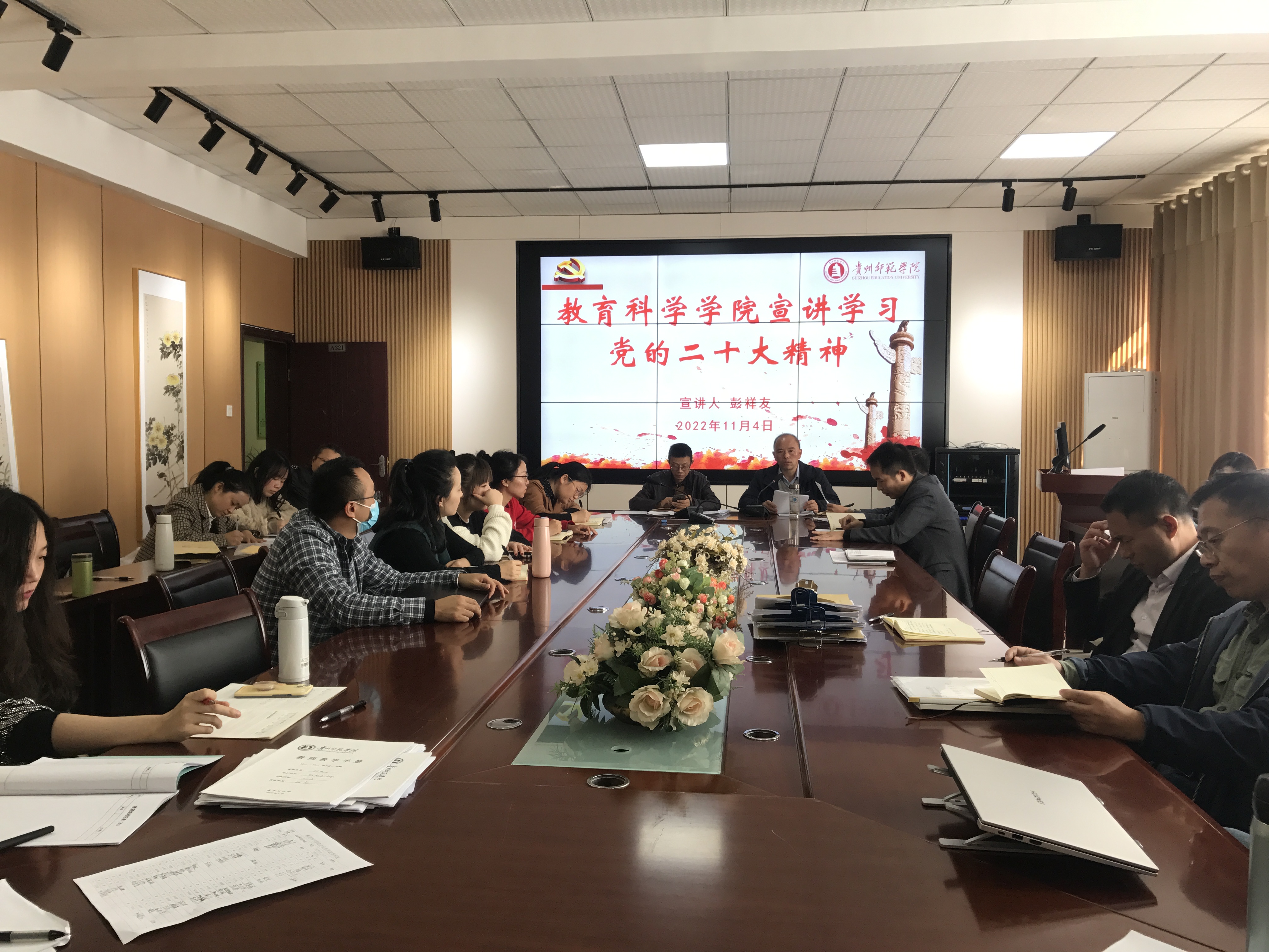 在逸夫楼A321会议室组织宣讲学习党的二十大精神,学院党委书记彭祥友宣讲,全院教职工参加学习。