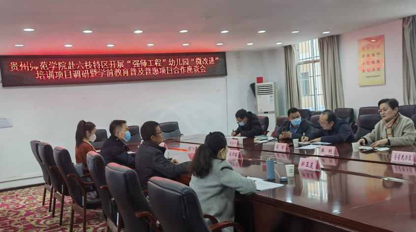 宋万琚院长、袁川副院长、郑玉莲教授、罗婷老师和刘晓红老师等一行5人赴六盘水市六枝特区教育局,召开学前教育普及普惠合作座谈会并开展“强师工程”幼儿园“微改进”培训项目跟踪指导活动。六枝特区党委常委、副区长宋毓,六枝矿区社区服务管理局局长、特区教育局党委书记、局长牟艳,六枝特区人民政府办公室、教育高质量发展工作专班、教育局分管负责同志及教育局学前民办教育股部分工作人员出席了会议。