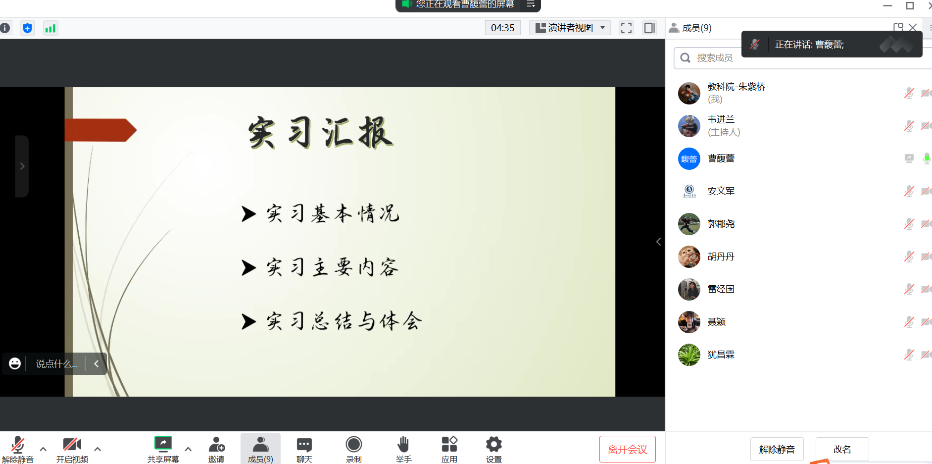 特殊教育专业优秀实习生实习汇报于2022年3月30日下午在腾讯会议上进行。会议由系实习领导小组组长朱紫桥主持,出席本次汇报会议的有雷经国、邓秀平、安文军等本专业老师。