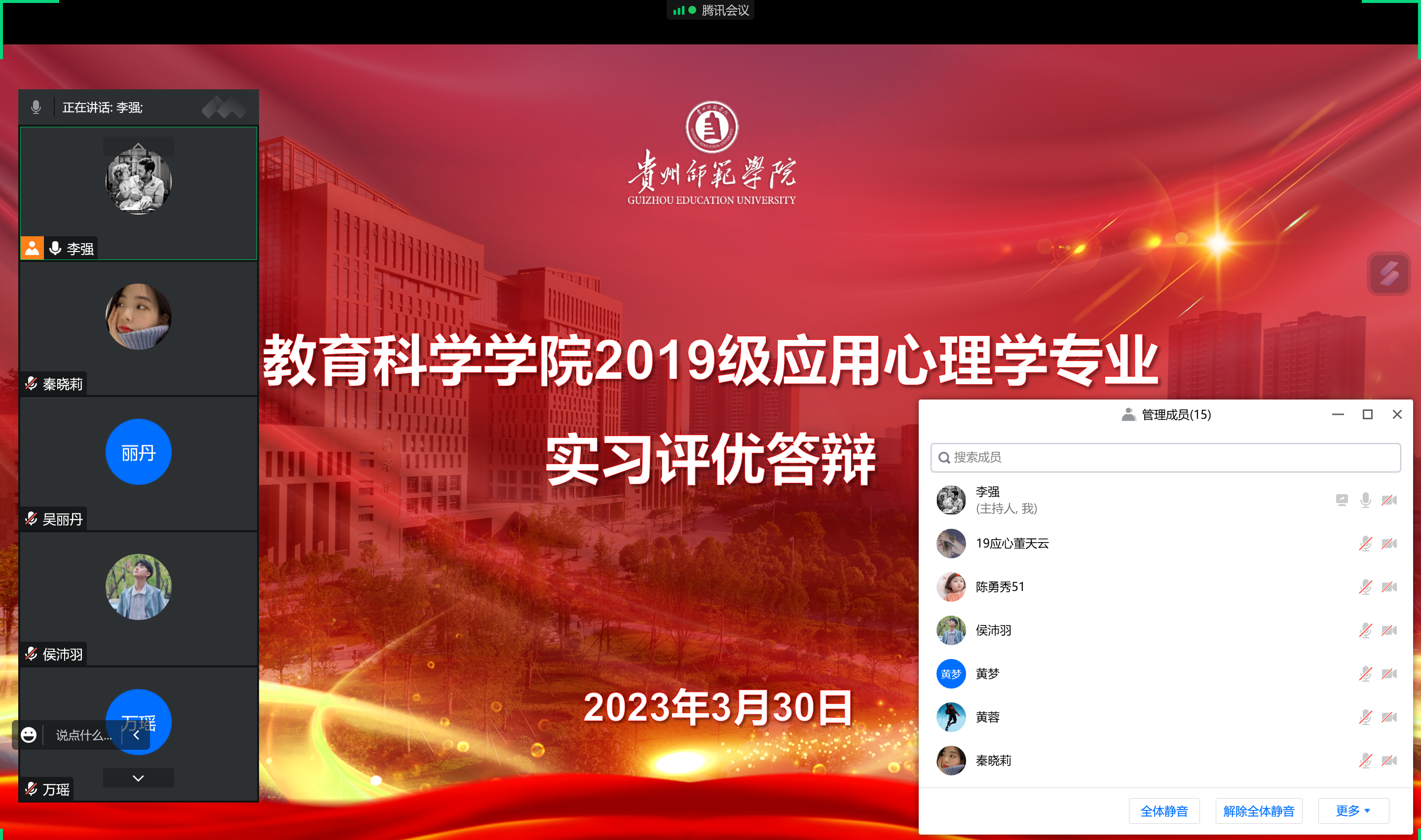 应用心理学专业优秀实习生实习汇报于2023年3月30日下午在腾讯会议上进行。会议由李强老师主持,出席本次评选活动的有黄蓉、张金勇等本专业老师。