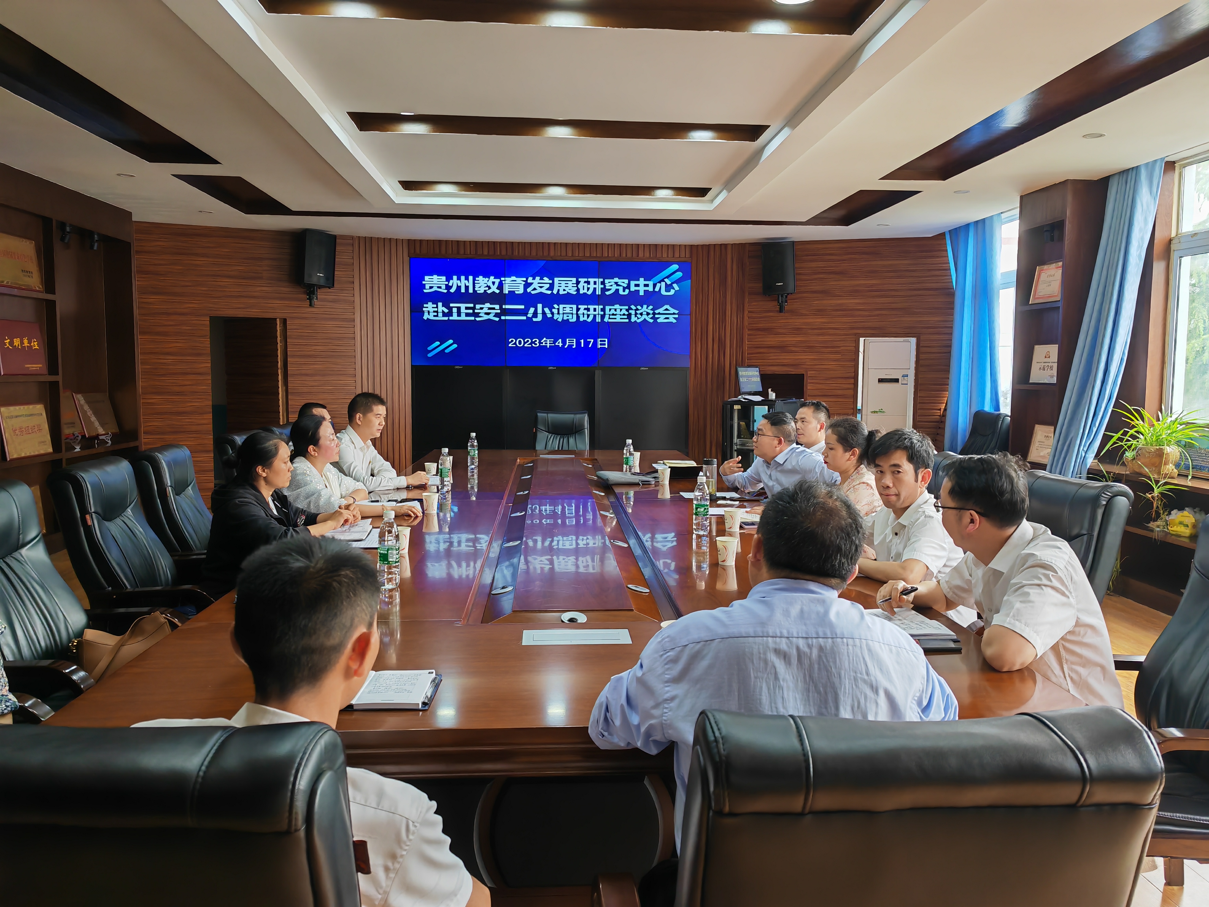 整个调研活动得到了两个县的教育体育局的大力支持和各中小学的紧密配合,在正安县教育体育局副局长向承凤、湄潭县教育体育局副局长邬文强及相关人员带领陪同下,调研组先后到了正安县教育体育局、正安县第二小学、正安县第七中学、湄潭县实验小学、湄潭县茶城中学和湄潭县教育体育局展开了一系列的现场考察、情况汇报和座谈,除上述以外的八所中小学、幼儿园参与了座谈。现场考察环节,调研组了解了四所中小学学校整体建设情况、办学理念和特色、地方和校本教材建设情况和取得成果;情况汇报和座谈环节,调研组深入了解了各所学校建设工作开展过程、好的经验做法和存在的痛点、难点和重点。围绕如何搭建共建共享共同发展,双方充分发表了意见和建议,形成了高度共鸣和一致认识,就下一步工作目标和任务进行了初步研讨。