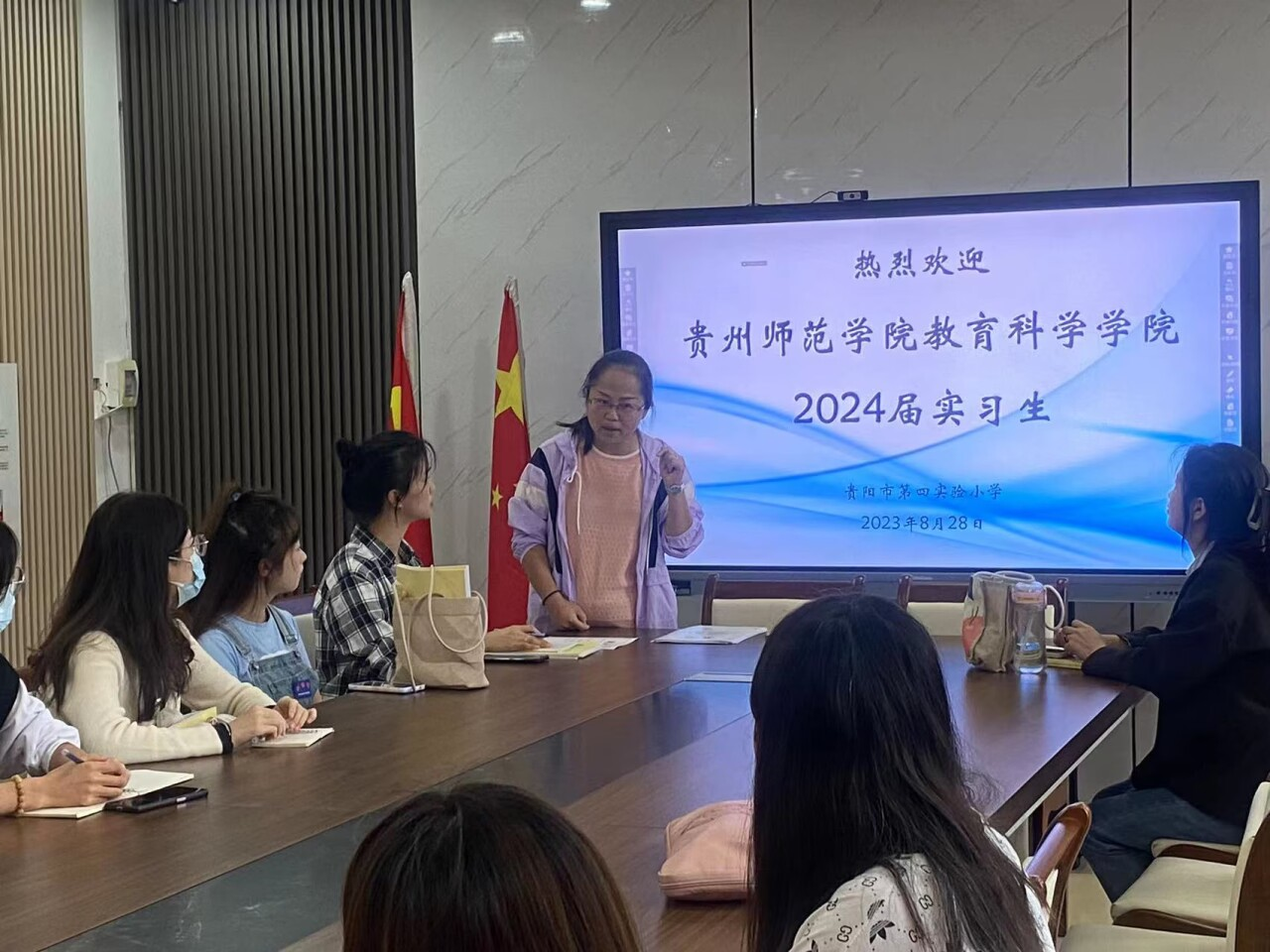 8月28日上午,艺术教育专业12名实习生赴贵阳市第四实验小学开展实习实践工作。本次实习由实验第四小学教导处主任陈舸老师负责带领实习生们开展实习工作交流,陈舸老师首先在学校三楼会议室对实习生表示热烈欢迎,并讲解了本次实习工作的管理规定和近期相关实习工作安排以及注意事项,随后陈舸老师向同学们介绍了艺术专业的三位实习指导教师,并组织实习生们进行自我介绍。最后陈舸老师进行了实习动员讲话,她希望每一位实习生在实习地能保持良好的学习状态,与自己的实习指导老师配合好,努力提升教育教学、音乐与美术等专业技能,为将来能够成为一名合格的艺术教师而不懈努力!