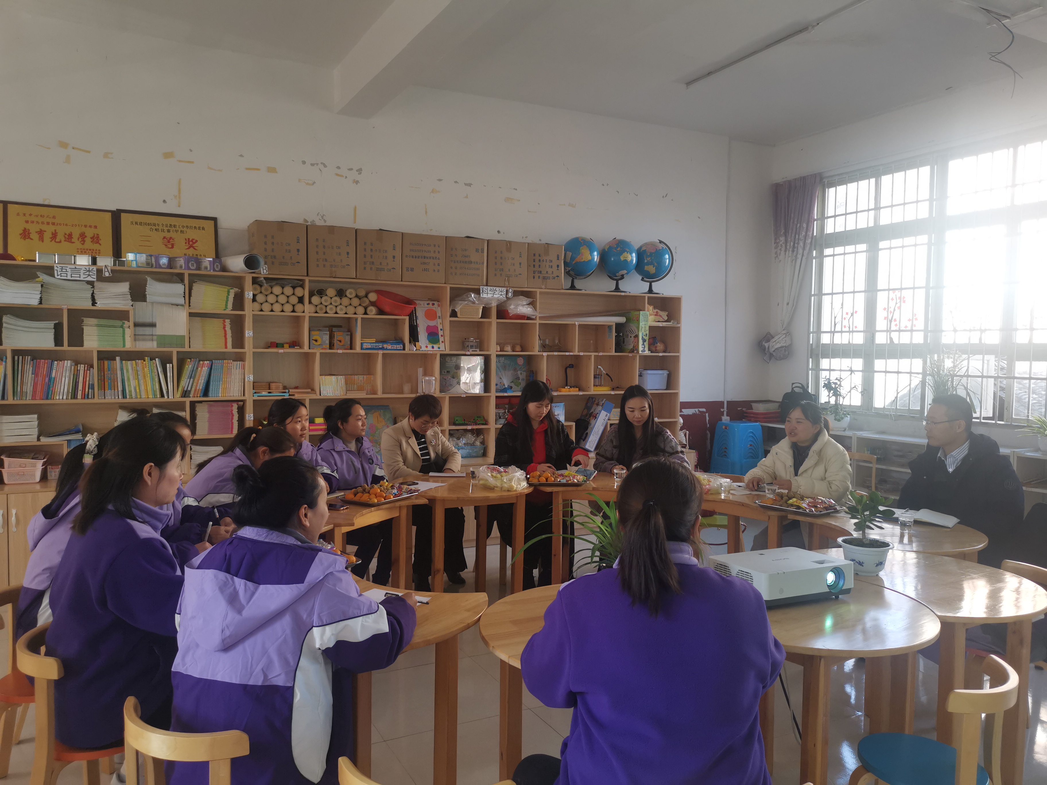 本次跟踪指导会议主要分为以下五个议程:首先,幼儿园吴艳辉园长介绍了幼儿园基本情况,反映了幼儿园目前在自主游戏一对一和园本教研上面的困惑;第二,大班组邓迎春老师分享了“百变大咖秀”主题课程实施经验;第三,幼儿园团队与训后跟踪团队基于汇报进行相互交流,各位参会教师就幼儿园课程方案与课程评价、课程方案的连续性、办园理念与地方特色、幼儿园课程方案构建路径以及主题课程系统性、连续性、延伸性等进行交流;第四,专家教师在幼儿园团队带领下参观幼儿园班级环境,对幼儿园环境建设进行讨论与交流。