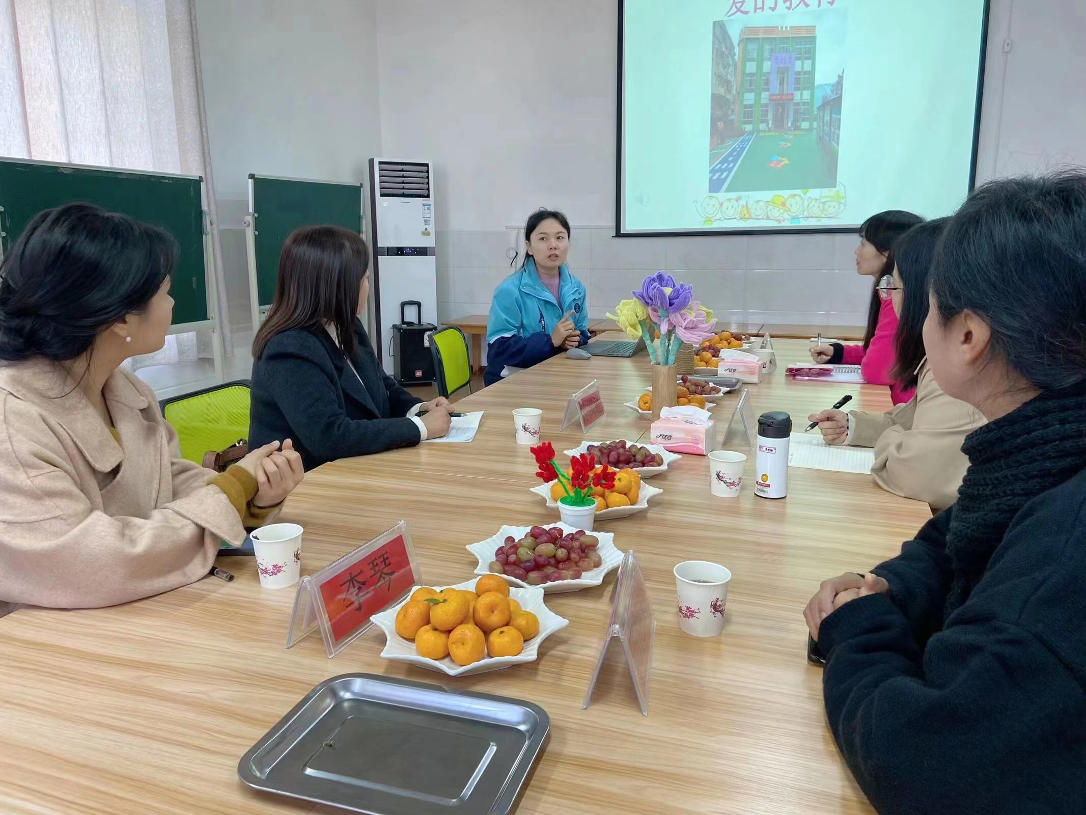 首先,项目组团队实地查看了园所环境及教师教学过程,通过观察记录初步了解幼儿园情况。随后项目团队成员与学员进行深入交谈,了解学员是否将培训阶段所学的先进教育教学理念、知识和方法应用于教学实践。座谈会上,卧龙小区幼儿园姚园长就幼儿园基本情况及返岗后的实际困惑与现实需求作出汇报,针对学员提出的问题,项目组团队一一答疑解惑,为学员们提供行之有效的解决策略,同时项目组团队就观察中发现的问题与幼儿园所有老师进行交流讨论。最后,娄小韵主任作了总结性发言。