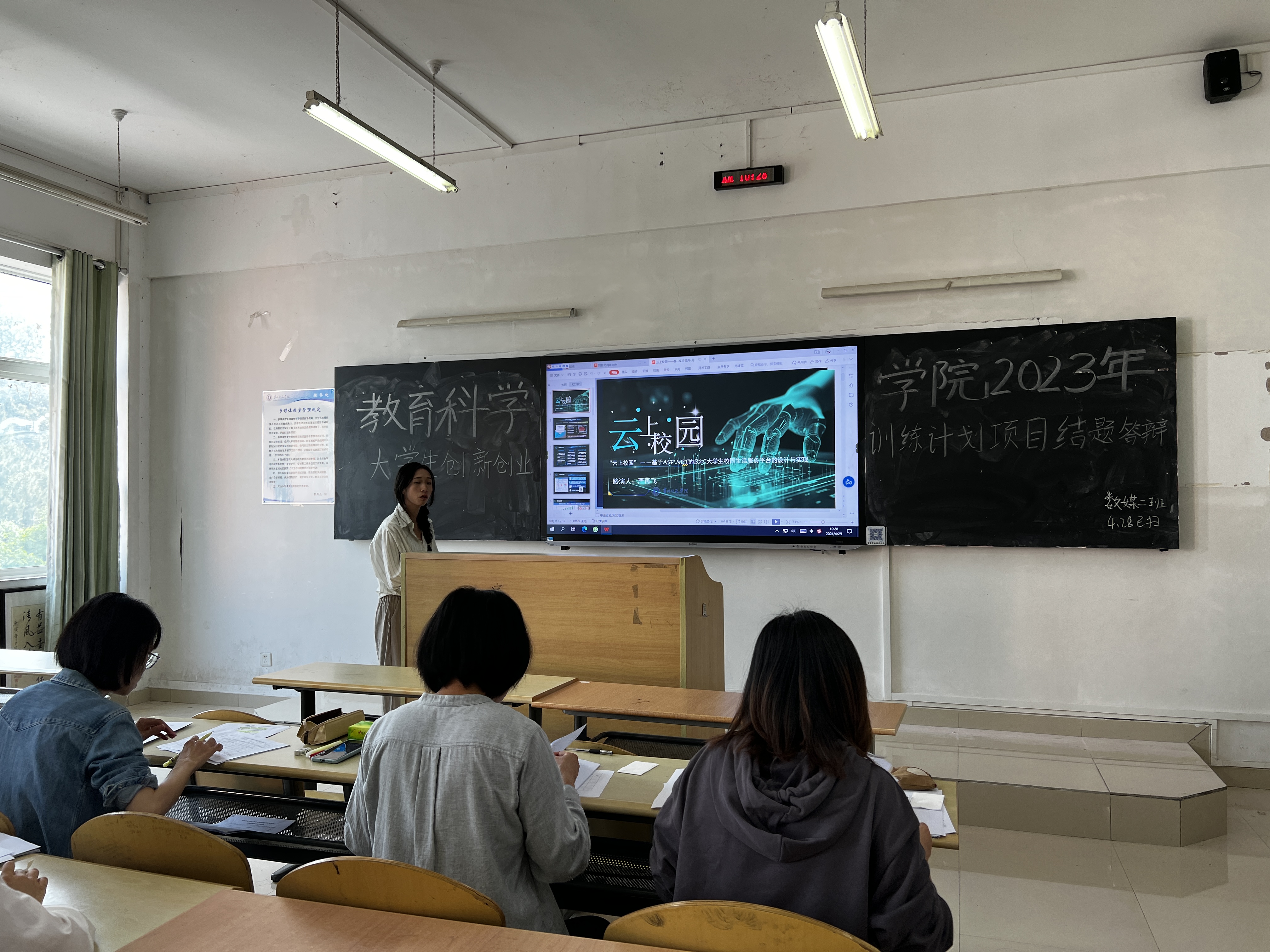 此次参与答辩的项目组共有12支,由刘婧、邓秀平、陈泽婧三位专业教师对他们的研究成果进行验收答辩,刘婧担任组长,申老师在答辩前强调答辩规则、细节,以确保验收答辩顺利进行。经过现场抽签决定答辩顺序后,首先项目负责人对项目进行PPT演示、讲解,其次由教师们进行提问,项目组同学进行解答,整场答辩过程非常精彩。其中获得国家级立项的《云上校园》项目获得三位评委老师的好评,该项目是基于互联网时代为满足大学生多样化需求所设计的小程序,单日访问已超10万,用户累计3万,预计促进就业10人,成果非常显著。三位答辩教师就各个团队项目所出现的数据真实可靠性、结论丰富性可取性、项目的针对性、专业知识性等问题提出自己的疑问并及时给出了不同层面的提升建议,一定程度上肯定了团队的创新能力,希望同学们在此次答辩后,能够把研究结果与现实结合,做出更多有实际意义的研究,并且运用到实际生活中。