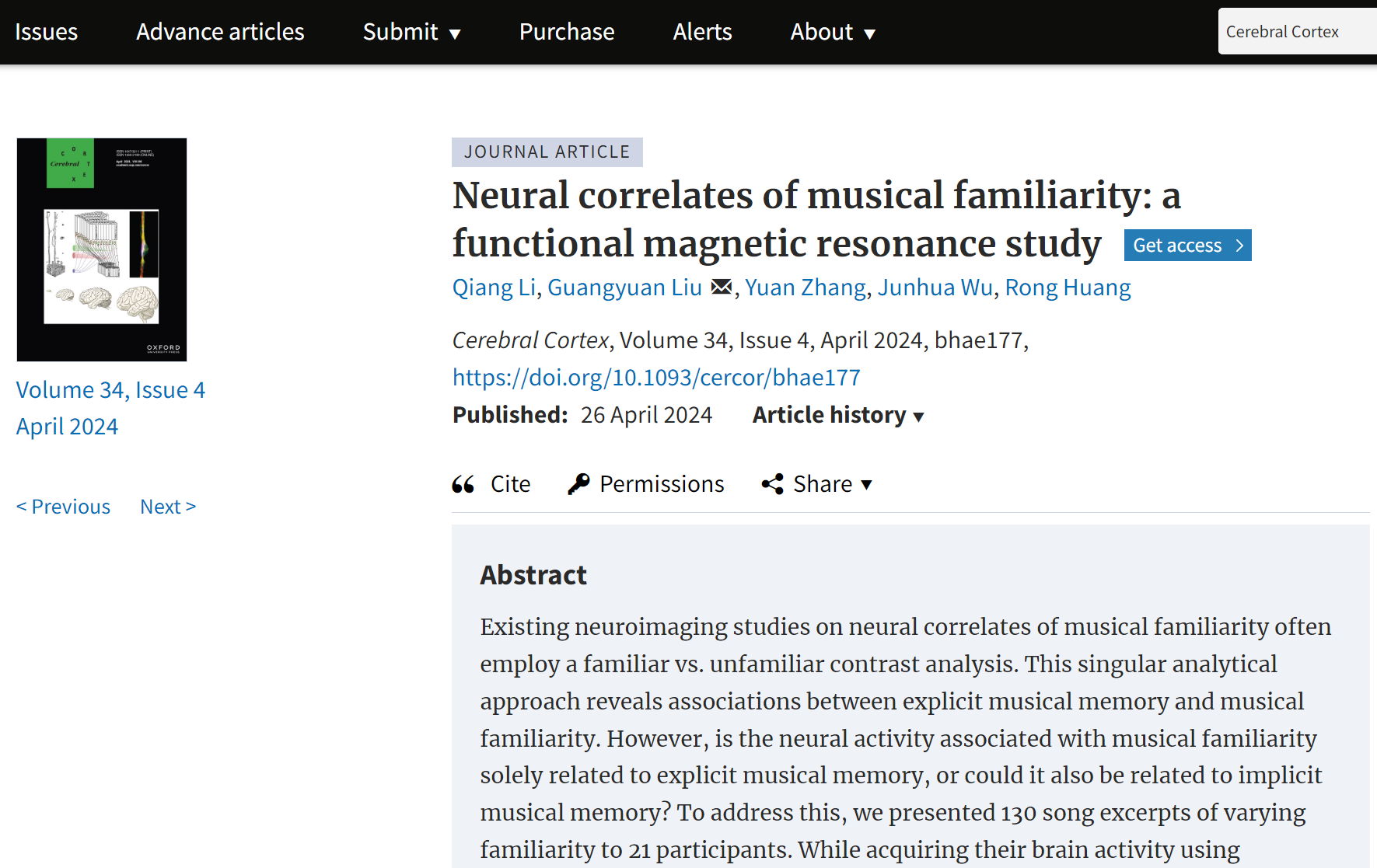 教师李强、张源、吴俊华、黄蓉以及西南大学刘光远教授在音乐的神经加工基础方向的一项重要研究。这项研究的论文标题为“Neural correlates of musical familiarity: a functional magnetic resonance study”,已发表在著名神经影像刊物《Cerebral Cortex》杂志上。