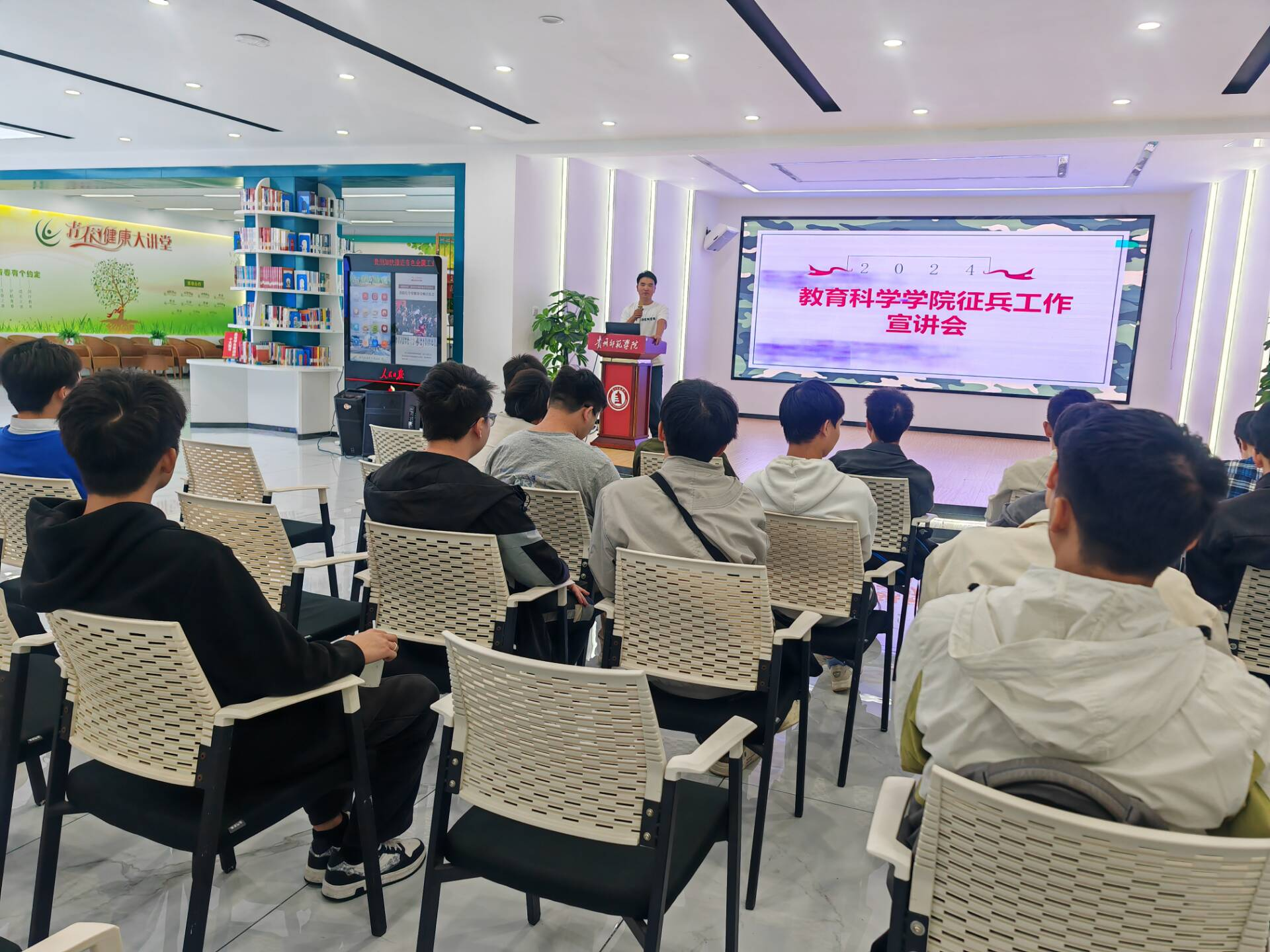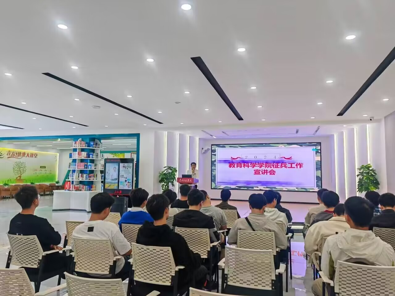 在大学生事务中心开展了2024年征兵工作宣讲活动。学院党委副书记傅小芳、征兵工作负责老师鲁蓓蓓、2021级班级辅导员张思远及2021级全体男生参加了此次活动。