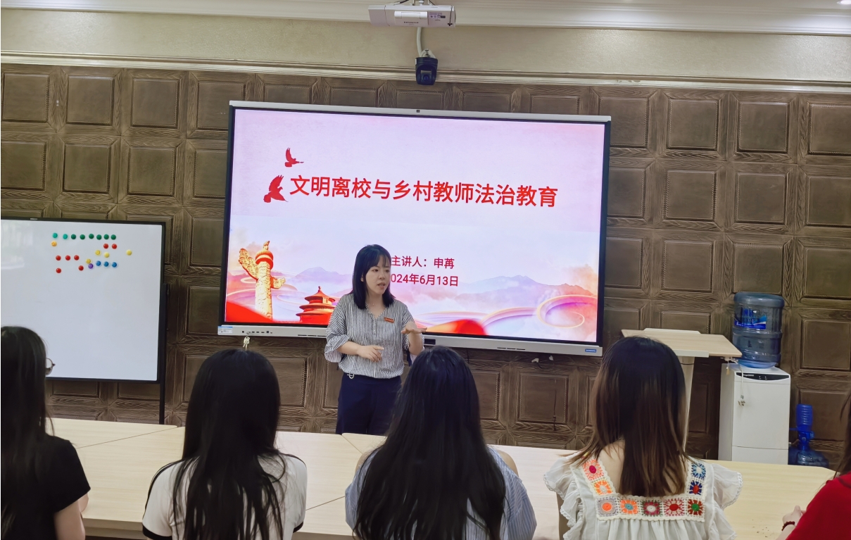 会上,申苒首先对同学们顺利毕业表示祝贺,希望大家能够在新的人生征程上再建新功,嘱咐大家要站好最后一班岗,继续发挥模范带头作用,在文明离校中作表率;其次,申苒围绕乡村教师法治教育进行了详细的宣讲,她强调,作为师范生要知法律于心,受法律于行,在今后的工作中要依法执教,更好的保障学生的健康成长,不仅要做法律的传播者,更要做法律的实践者,同时也要增强自我保护意识和法治意识,为孩子们的健康成长撑起“法治晴空”;最后,申苒和同学们就毕业去向和未来发展进行了现场交流。