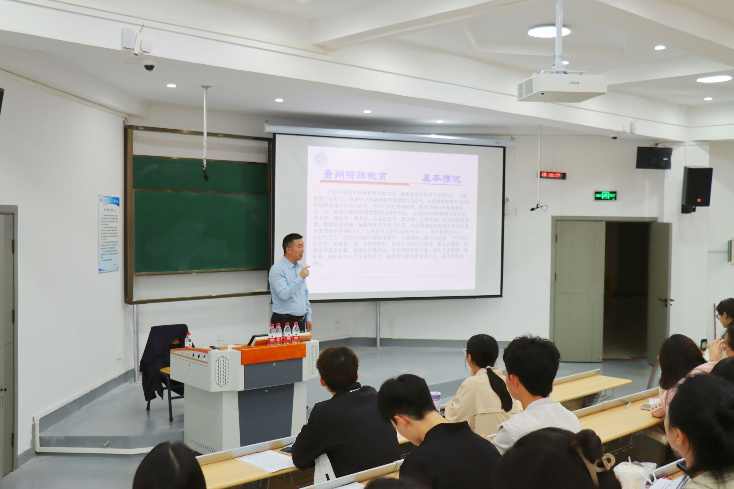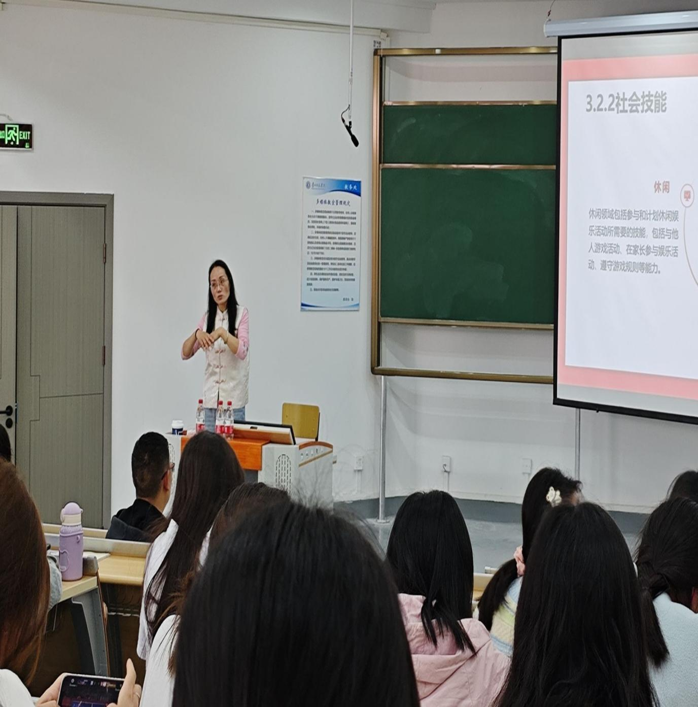 为进一步提高特殊教育系学生的教师需要的知识与实践技能,了解更多的特殊教育学校课程、教学、班级管理和教师的实践工作现状,2024年6月3日,特殊教育系邀请了遵义市特殊教育学校校长余贞文、刘晓敏2位教师,在宁静楼535为特殊教育系2023级、2022级、2021级特殊教育专业全体学生分别做了《特殊教育学校教师职业素养现状与提升策略》和《孤独症儿童融合教育实践策略》的主题讲座。