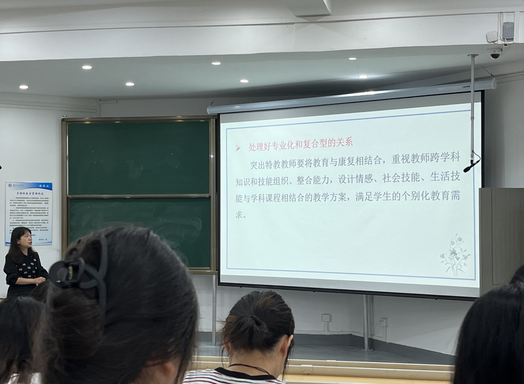 为进一步提高特殊教育系学生的教师需要的知识与实践技能,了解更多的特殊教育学校课程、教学、班级管理和教师的实践工作现状,2024年6月7日,特殊教育系邀请了遵义市特殊教育学校正高级教师王杨以及威宁特校教务处主任吕伟教师在宁静楼536 为特殊教育系 2023级、2022级、2021级特殊教育专业全体学生分别做了《未来特教教师必备的核心素养和关键技能》和《区域特殊教育教研活动推进现状、问题和策略》的主题讲座。