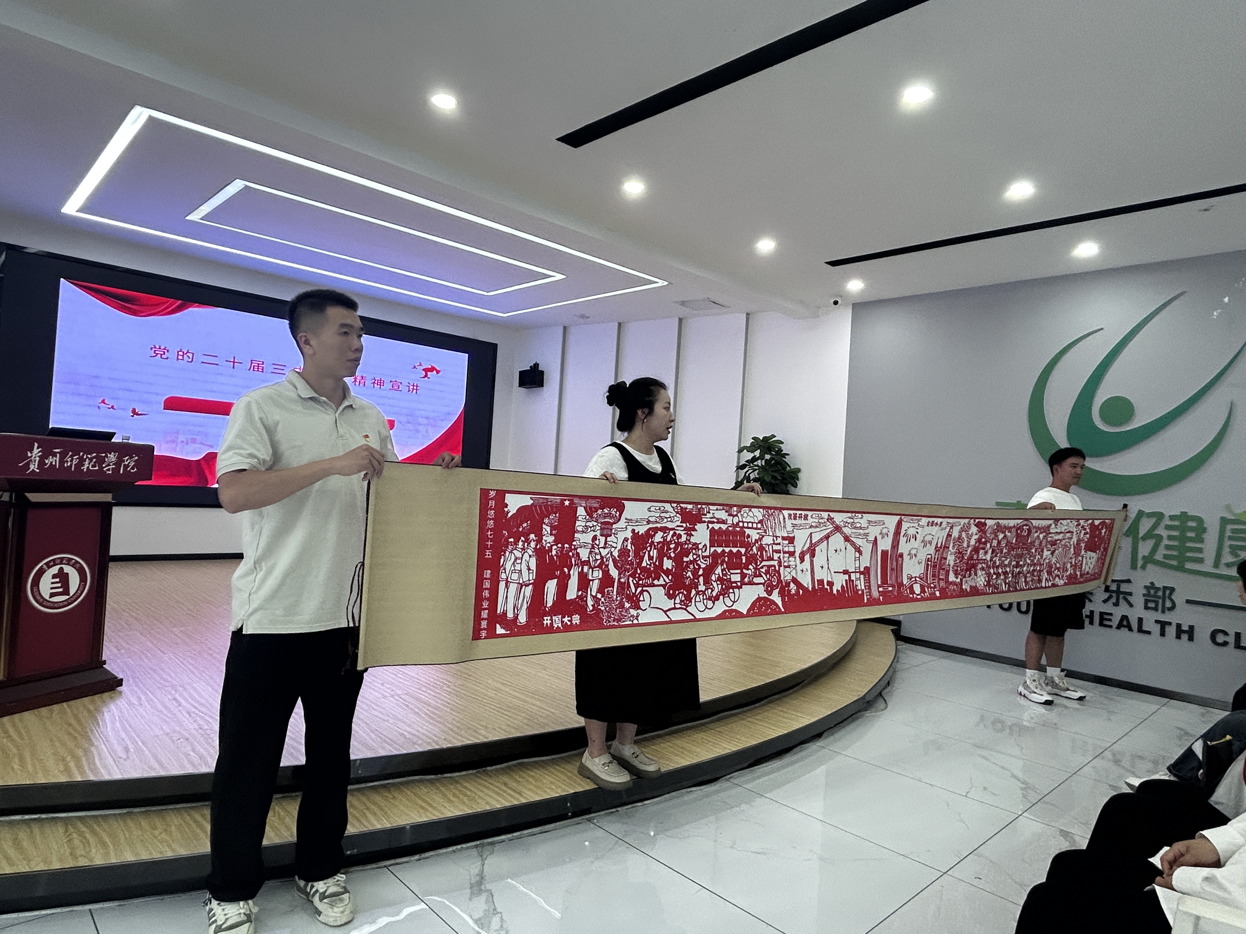 会议伊始,张源、吴章洪采取一人讲理论、一人讲实践的方式,用通俗易懂、形象生动的语言,讲述了党的二十届三中全会精神的10大关注点,分别是:教育、科研、就业、社保、农民增收、收入、住房、生育、医疗、养老,为大家上了一堂生动的理论宣讲课。随后,开设了有奖竞答活动,以巩固学习成效。最后,张源展示了学院师生共创的剪纸长卷,让到场听众生动的了解伟大祖国的发展历程。